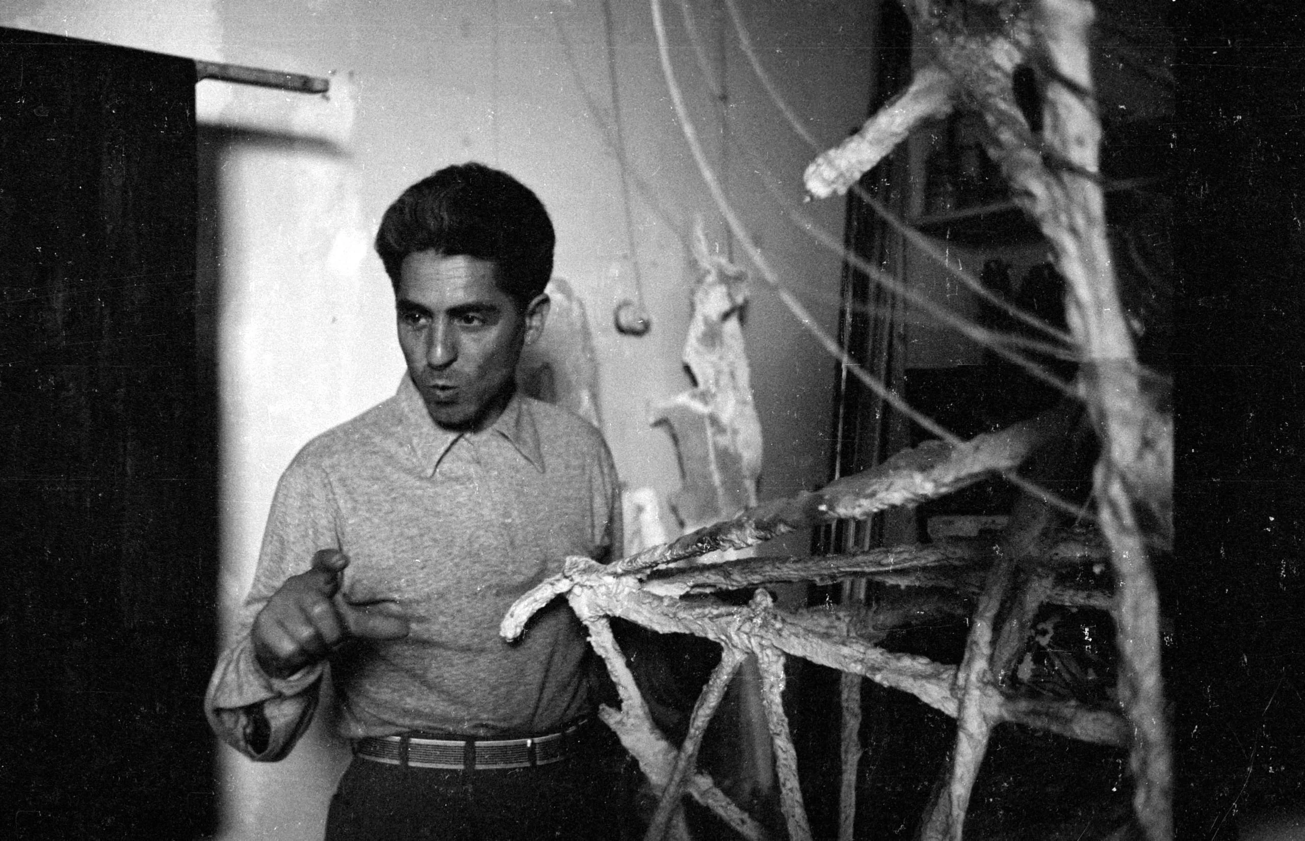 Black and white photograph of a man in a collared shirt standing beside a tall, rough-textured sculptural armature in a studio setting