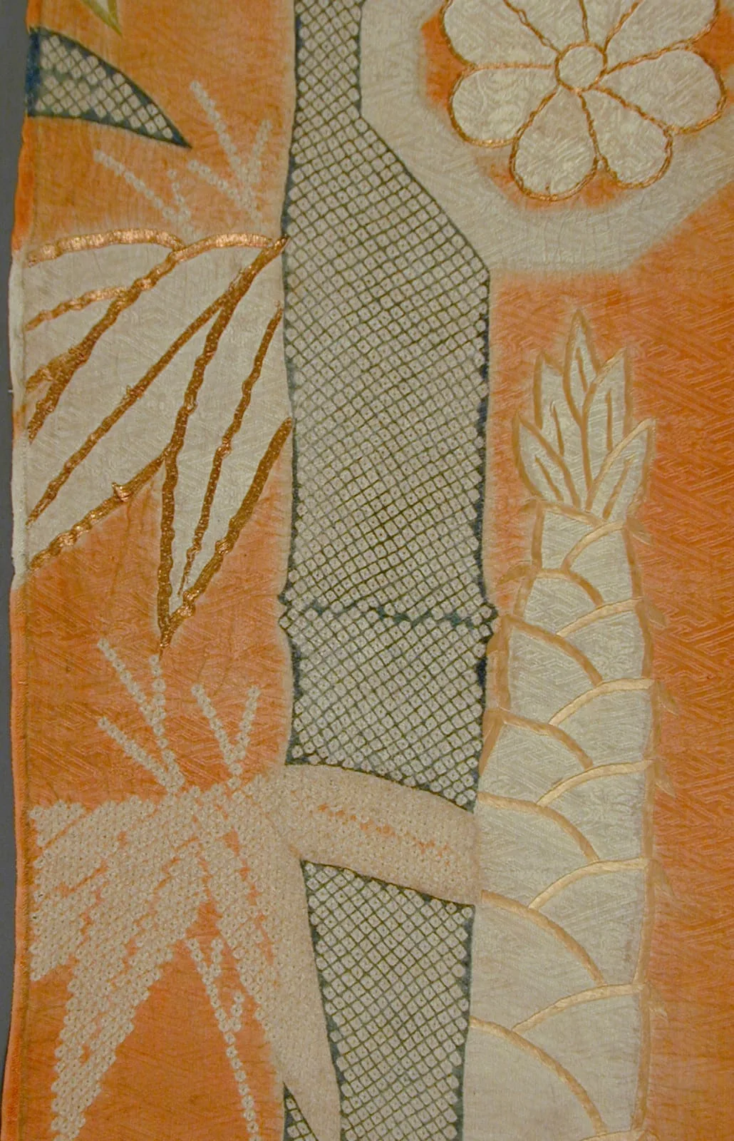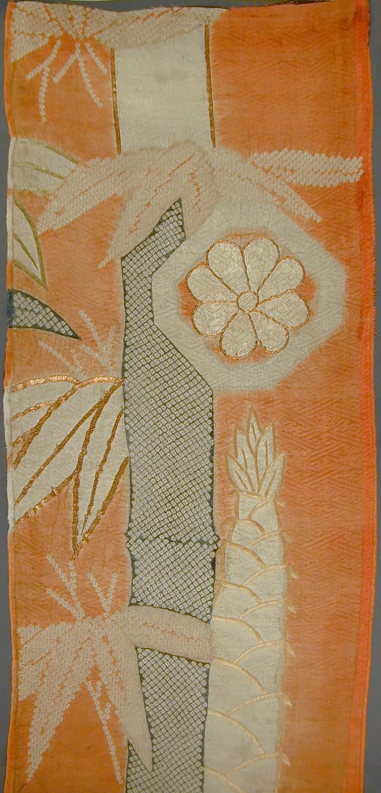 - Silk figured satin (rinzu), tie-dyed (kanoko and nuishime shibori) and stenciled imitation tie-dyed (kata kanoko), with silk and gilt-paper-wrapped-silk-thread embroidery, and appliqué