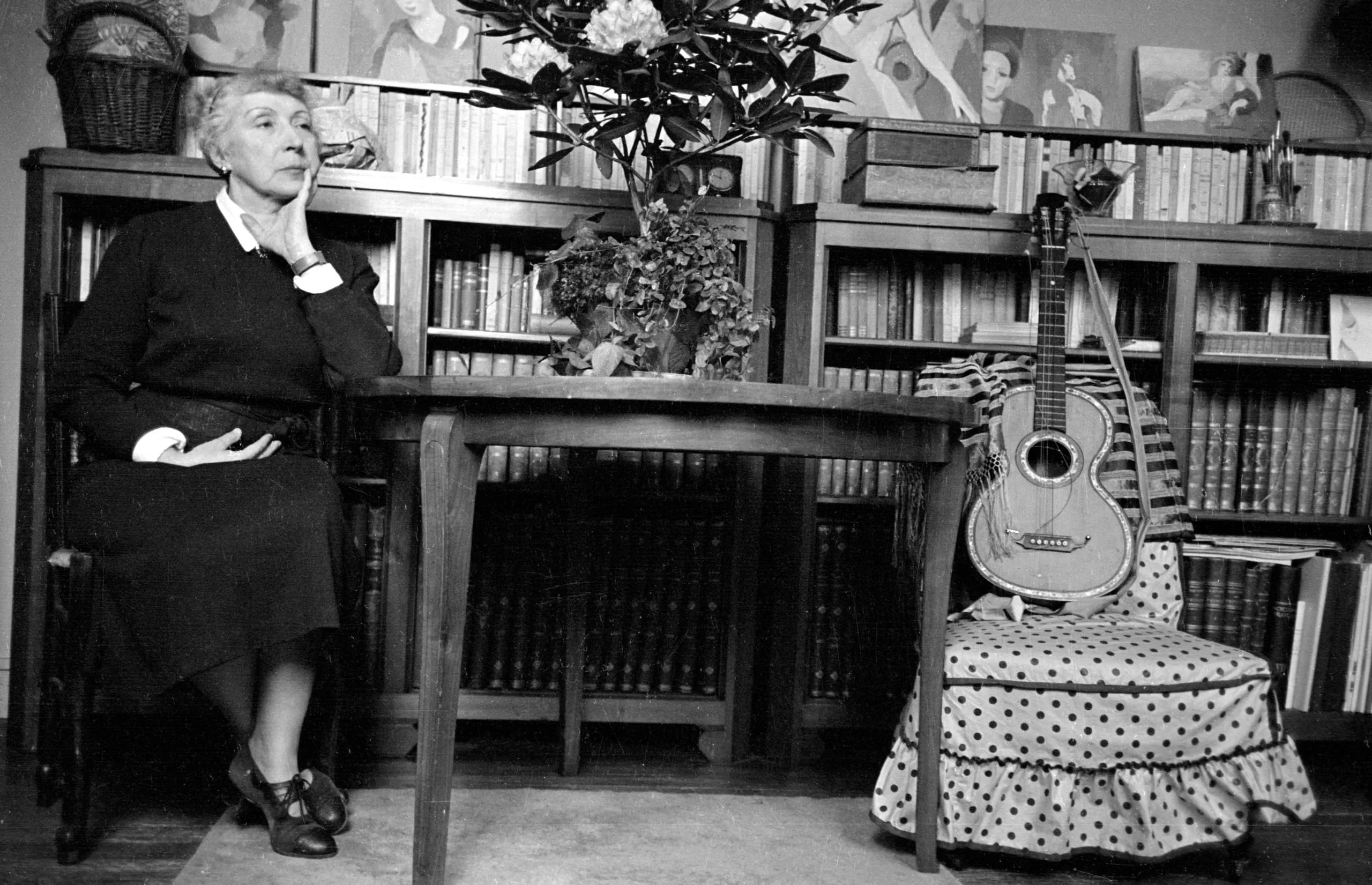 Black and white photograph of an older white woman in a dark dress seated at a wooden table, with bookshelves and a guitar leaning against a polka-dot chair behind her