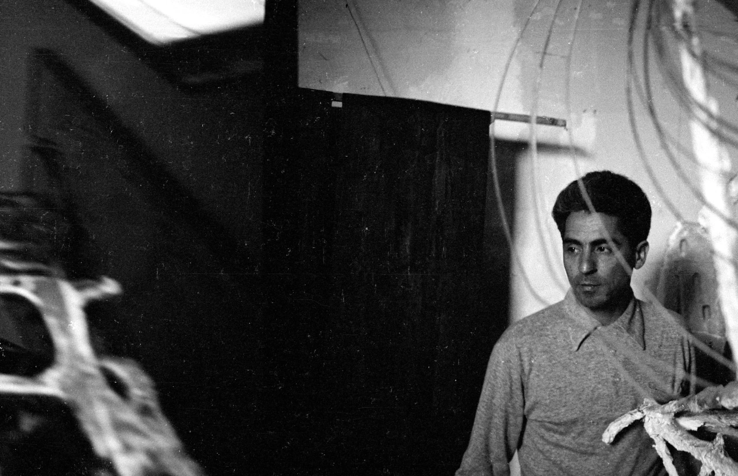 Black and white photograph of a man from the waist up in a darkened studio, looking to the left, with sculptural objects visible in the foreground