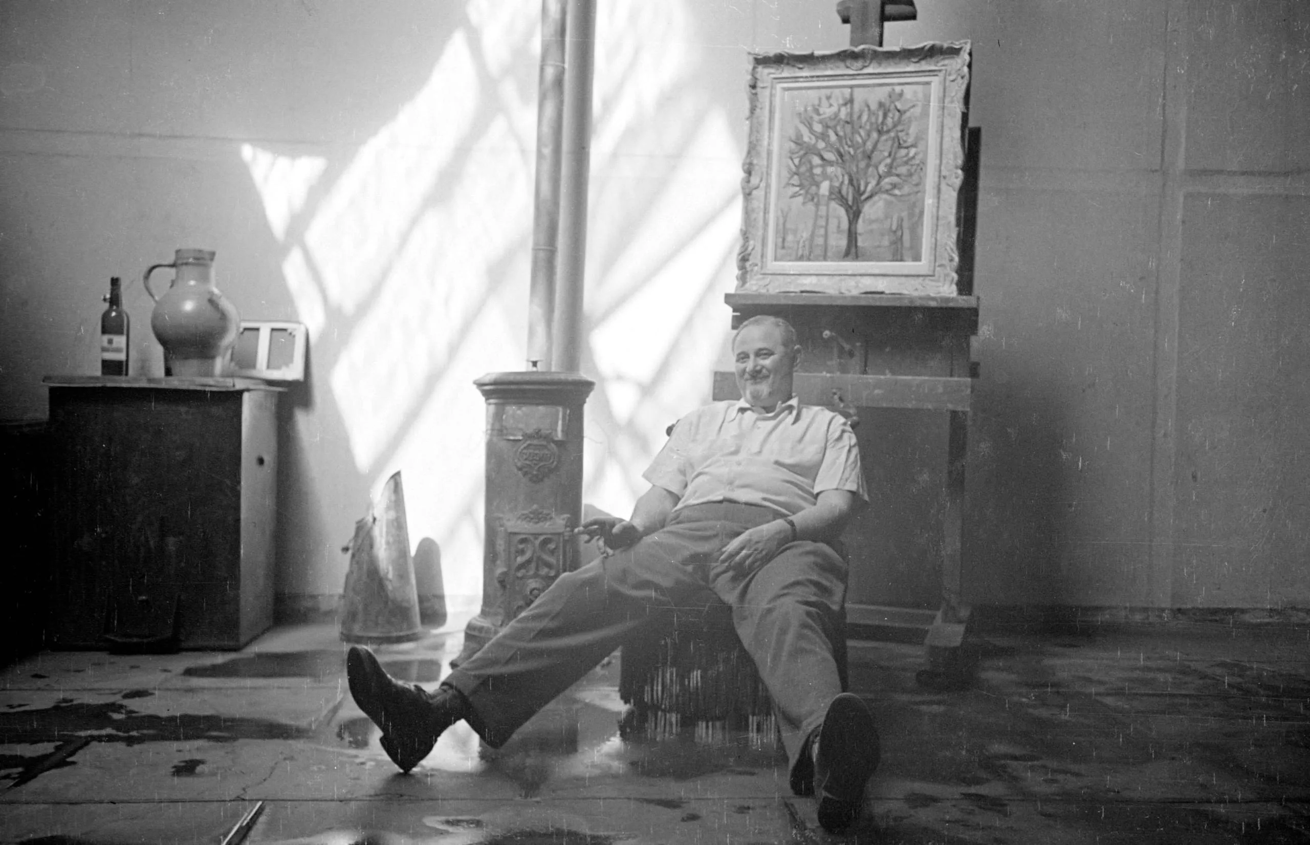 Black and white photograph of a smiling man seated in a studio chair, legs crossed, with an easel and painting behind him and strong diagonal light across the walls