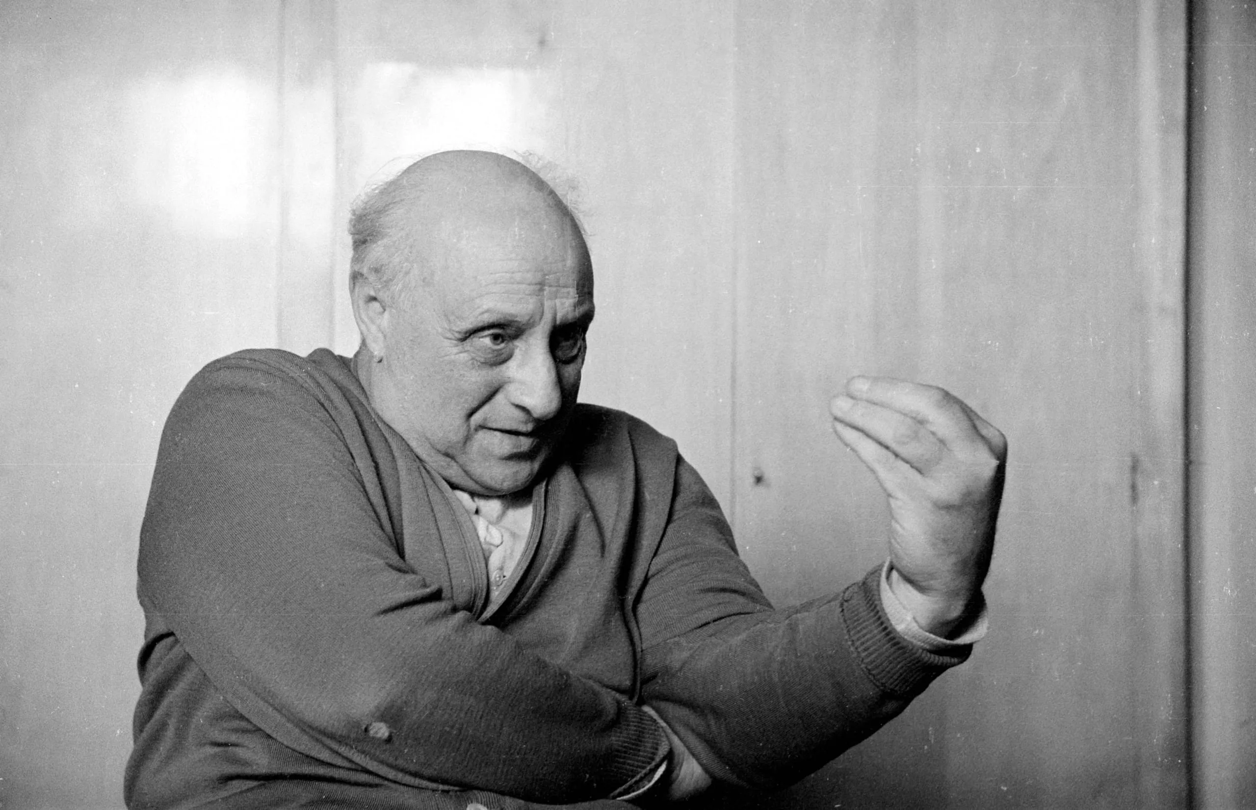 Black and white photograph of an older white man from the waist up, body angled left, one hand raised mid-gesture, soft diffused lighting