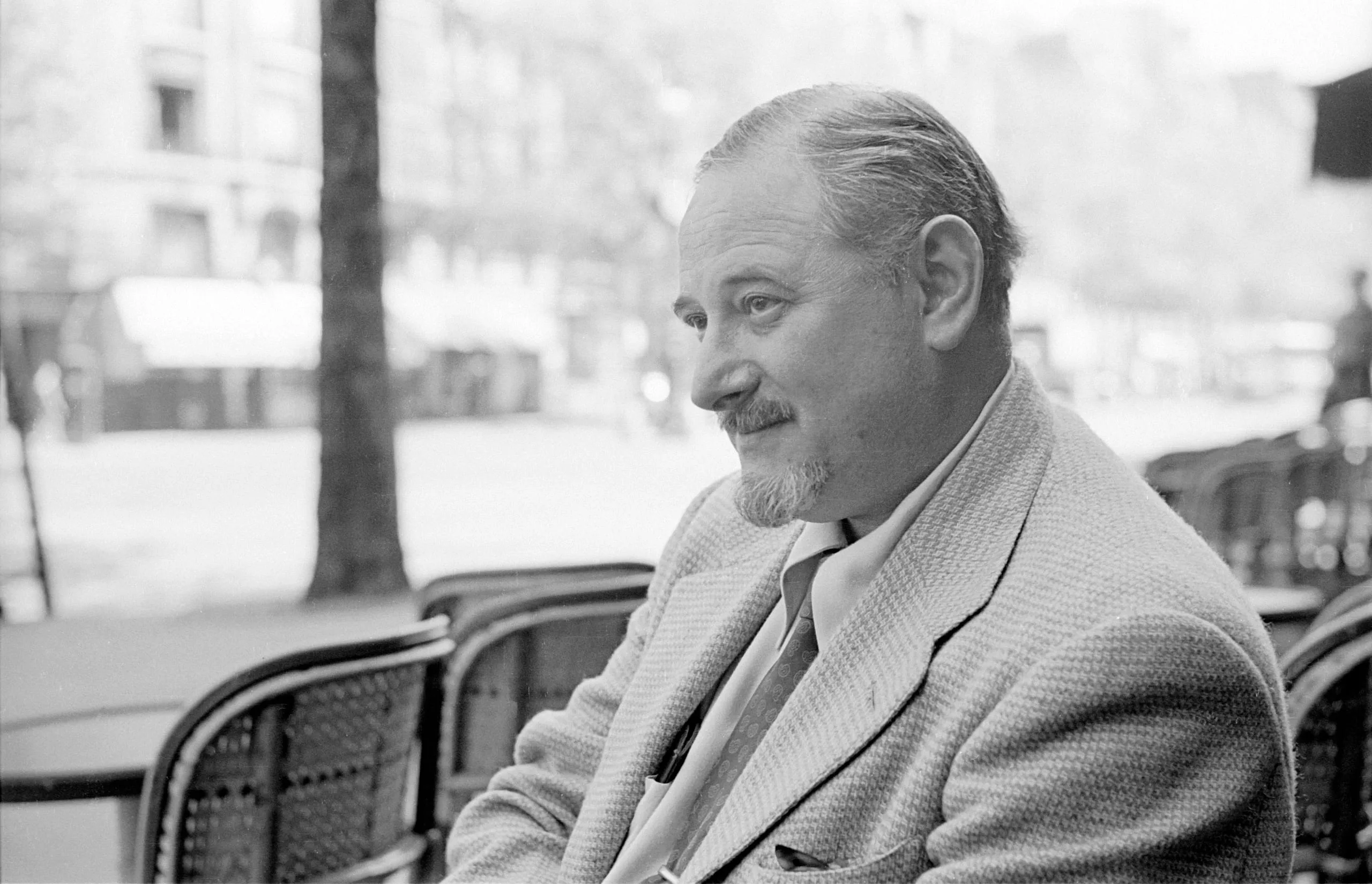 Black and white photograph, white man with a goatee seated at an outdoor café, body in three-quarter profile, soft diffused daylight, blurred city street in the distance