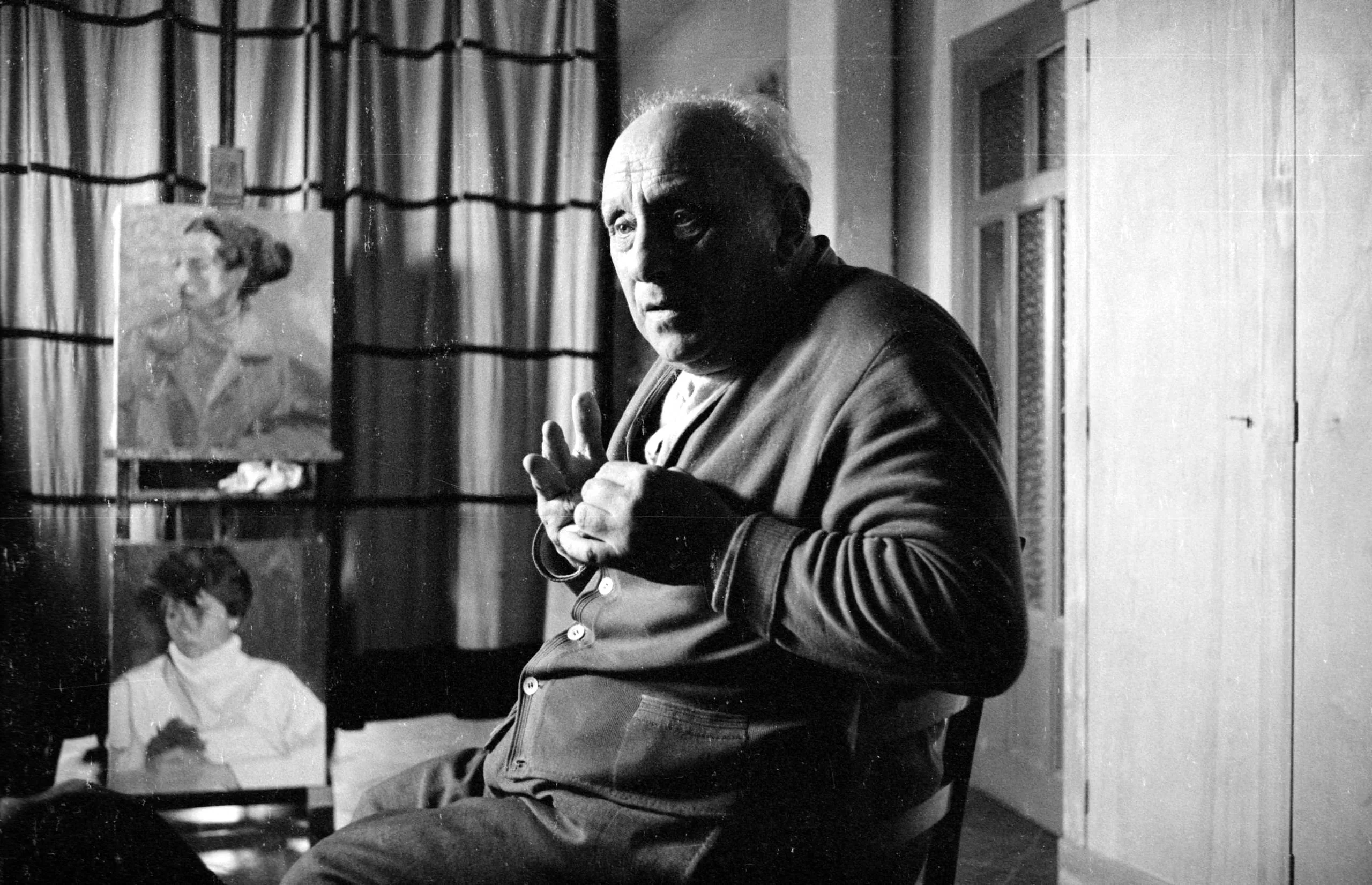 Black and white photograph of a seated, heavyset older man, nearly bald, mid-gesture with one hand raised, in a room with striped curtains and a painting on an easel behind him