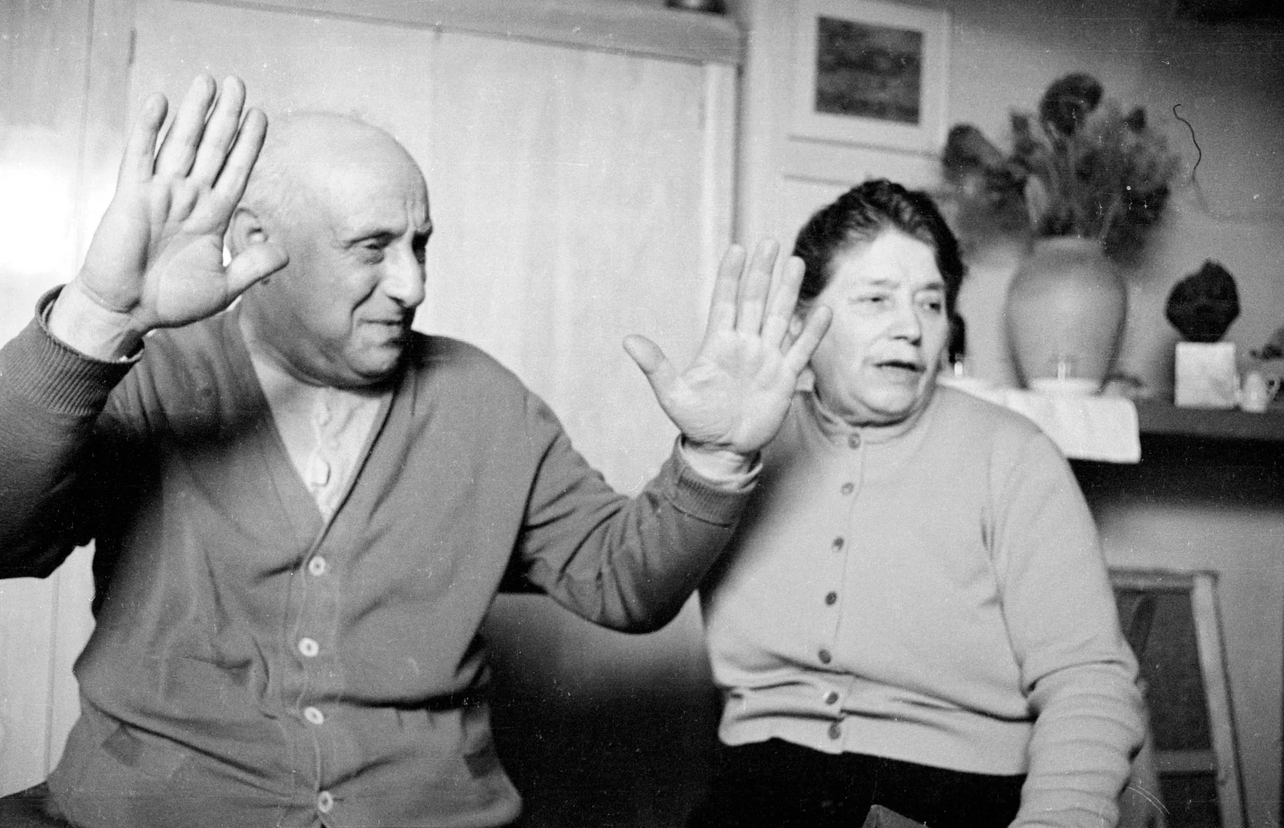 Black and white photograph of an older bald man and a dark-haired woman seated together, each raising one hand with palm facing outward