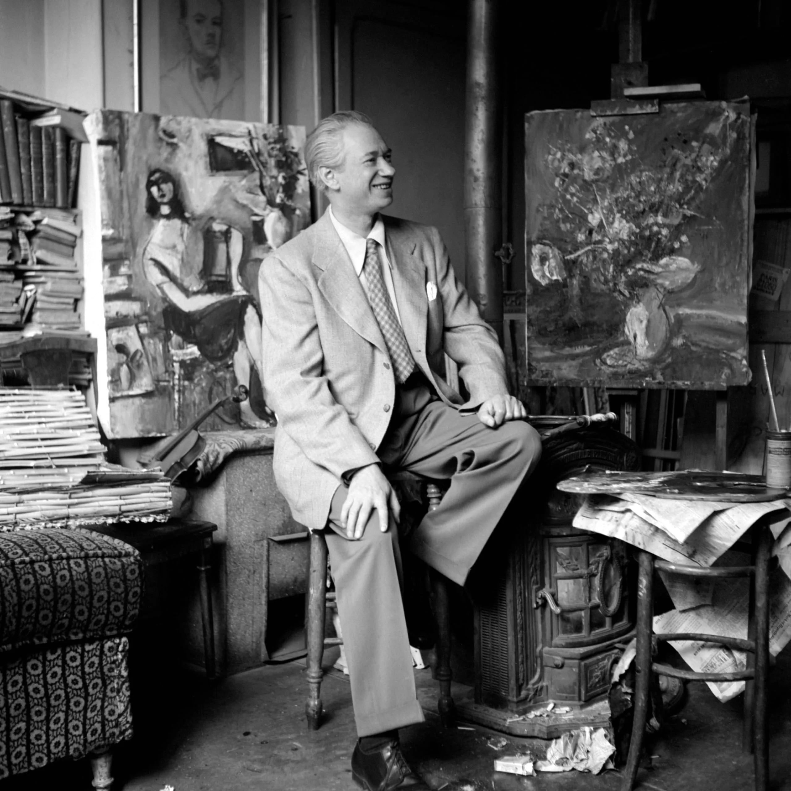 Black and white photograph of a man in a blazer and tie seated in an artist's studio, surrounded by canvases, an easel, and art supplies