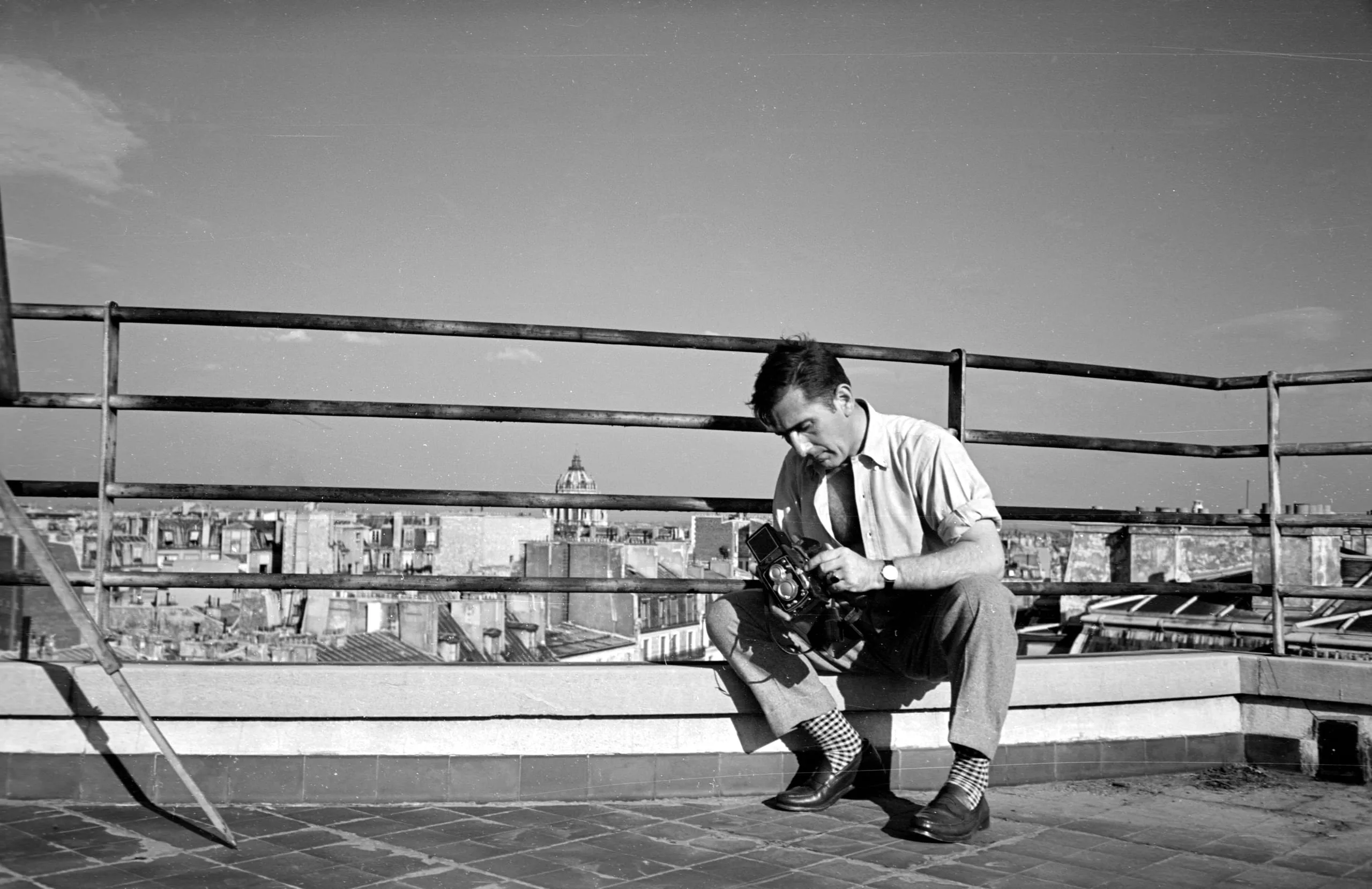 Black and white photograph of a man crouching on a rooftop, looking into a medium-format camera, with a city skyline and domed building visible behind him