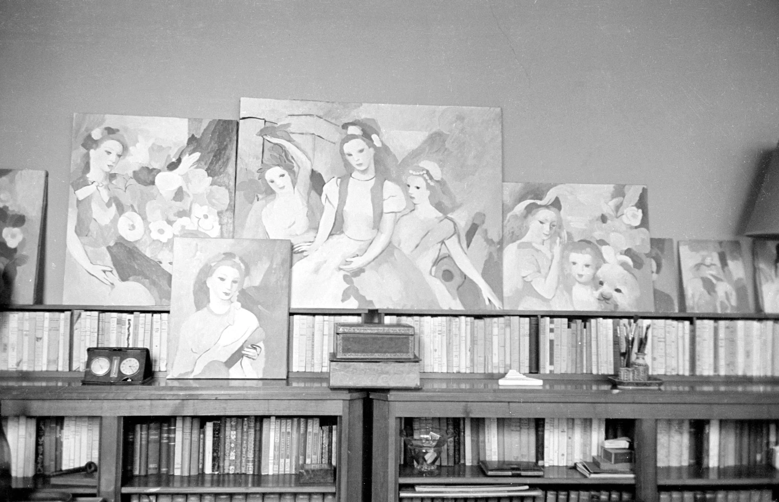 Black and white photograph of five semi-abstract paintings of female figures propped on top of a wooden bookcase packed with books