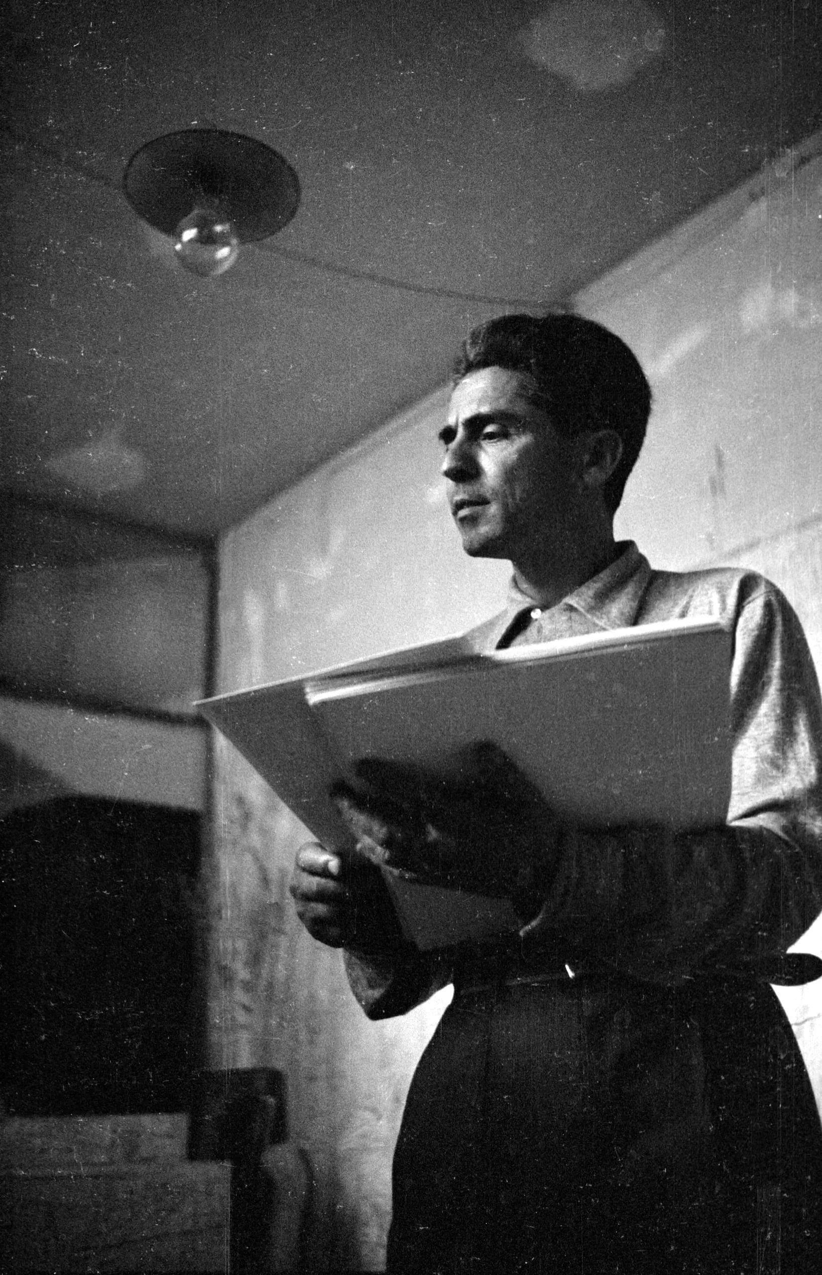 Black and white photograph of a man holding an open folder, lit dramatically from the right, looking upward in a dimly lit interior