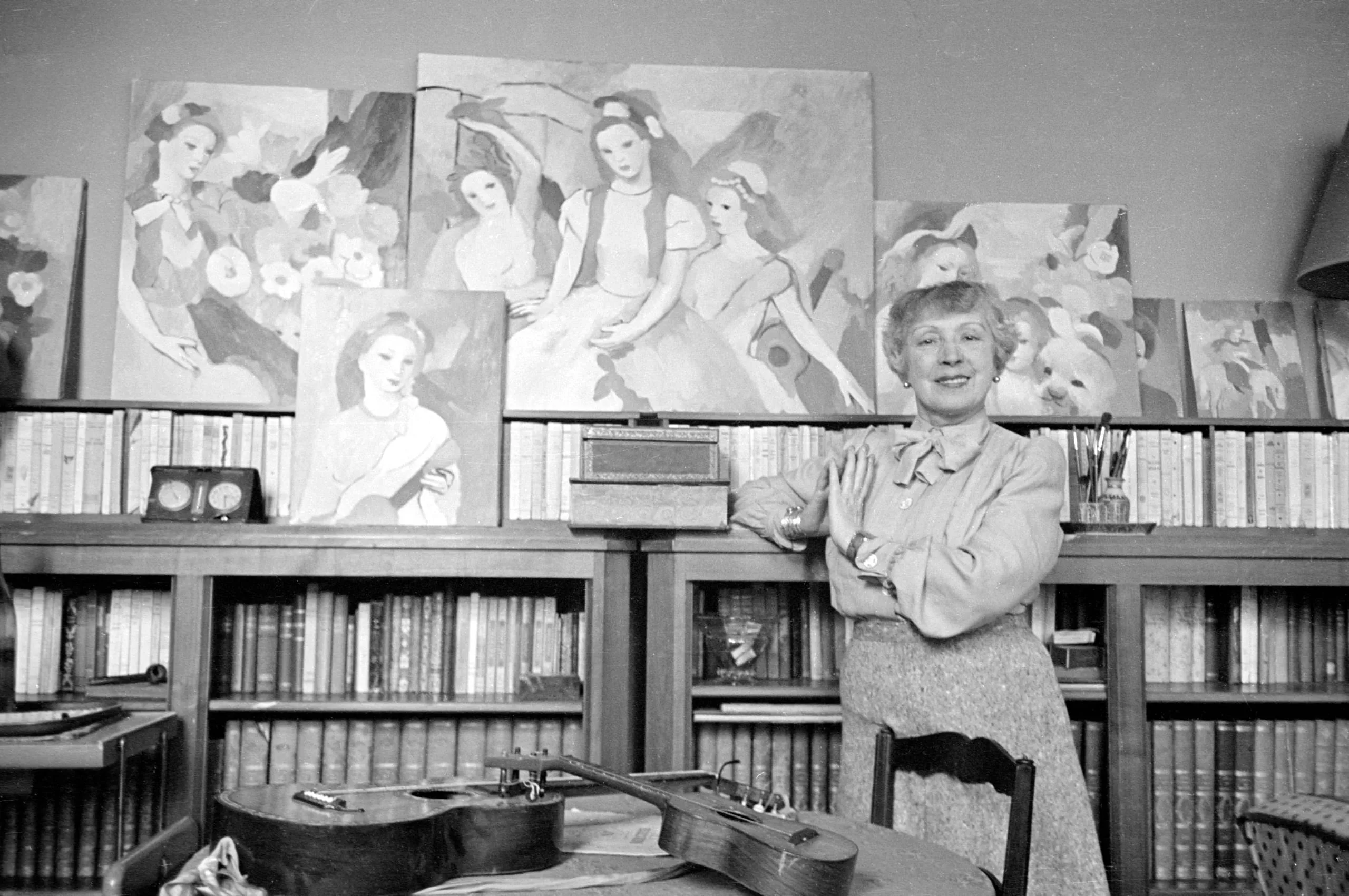 Black and white photograph of a smiling woman with crossed arms standing before bookshelves lined with modernist figure paintings of women