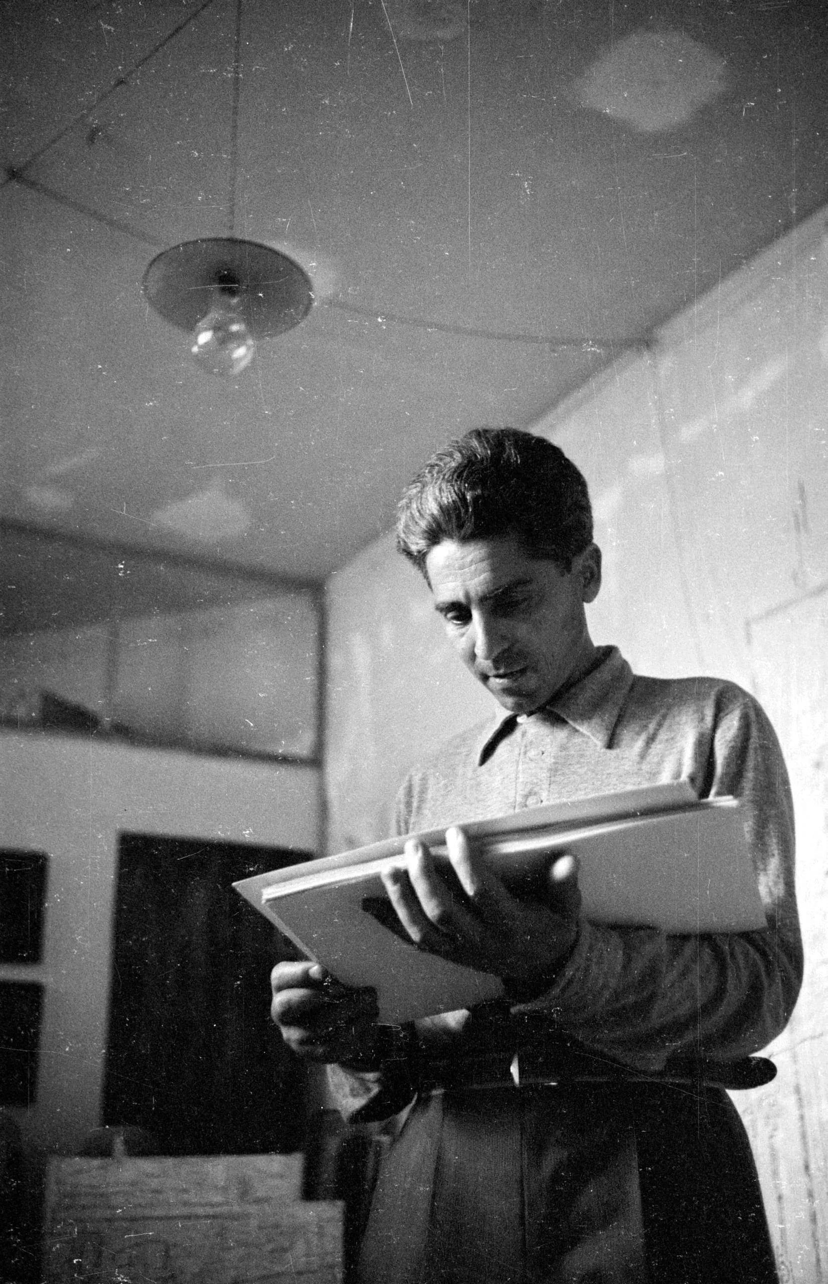Black and white photograph of a dark-haired man from the hips up, reading an open book under a bare hanging bulb in a dimly lit room
