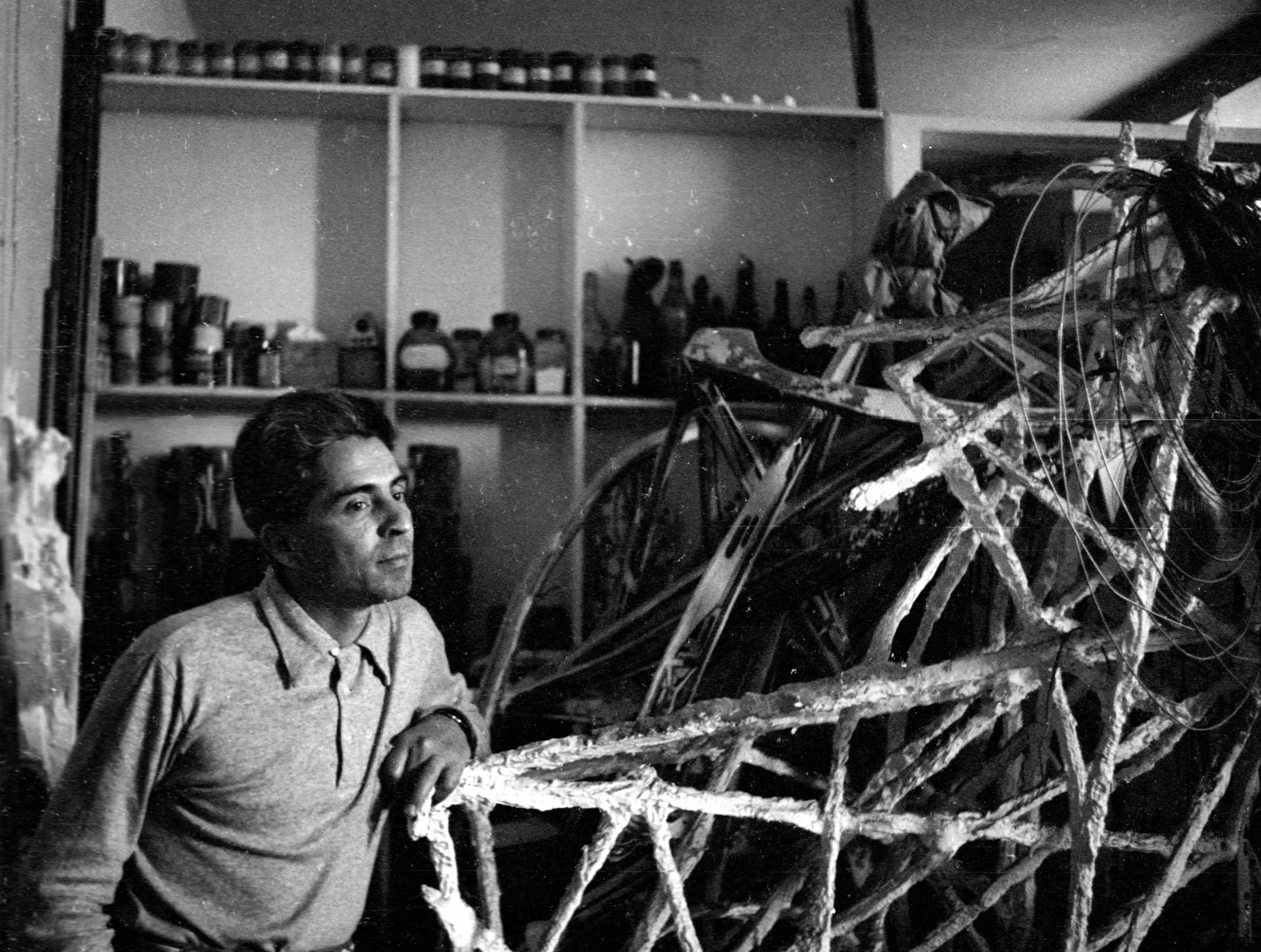 Black and white photograph of a man in a gray pullover leaning against a large plaster-and-wire lattice sculpture in an artist's studio, shelves of jars visible behind him