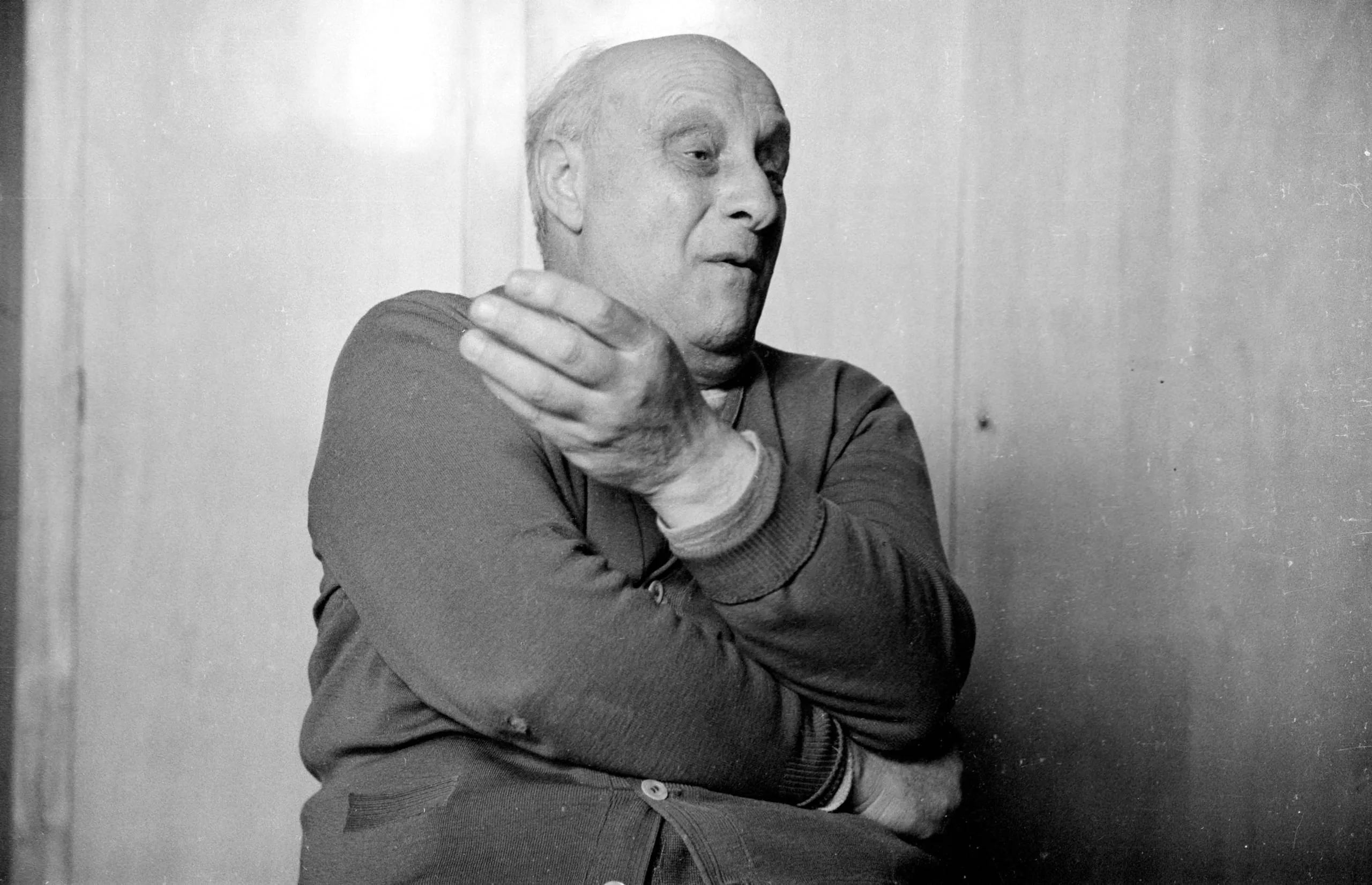 Black and white photograph, older bald man from the waist up, mid-gesture with one hand raised near his shoulder, soft directional lighting