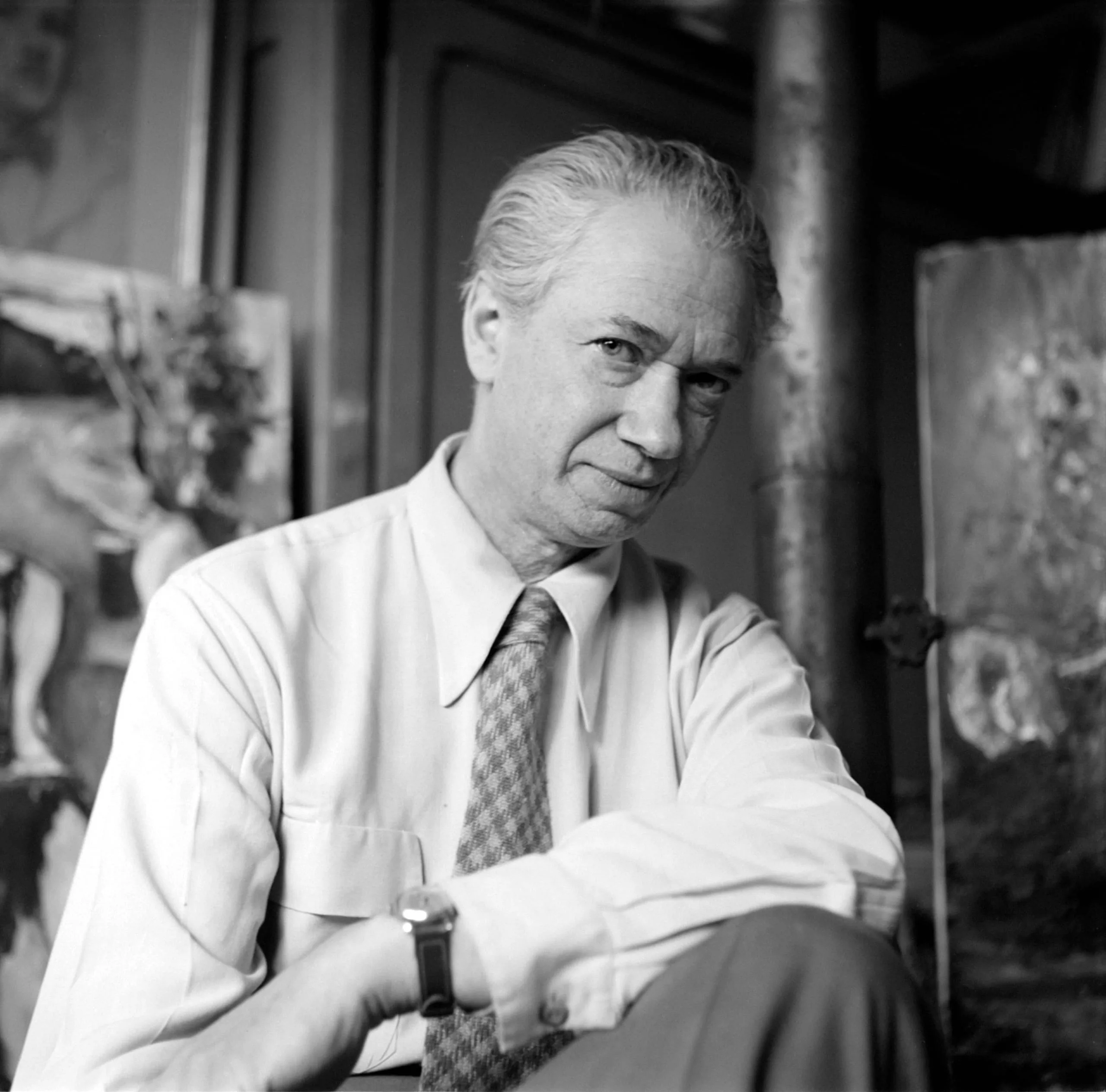 Black and white photograph, close portrait of a gray-haired white man in a white shirt and patterned tie, arms loosely crossed, surrounded by canvases in what appears to be an artist's studio