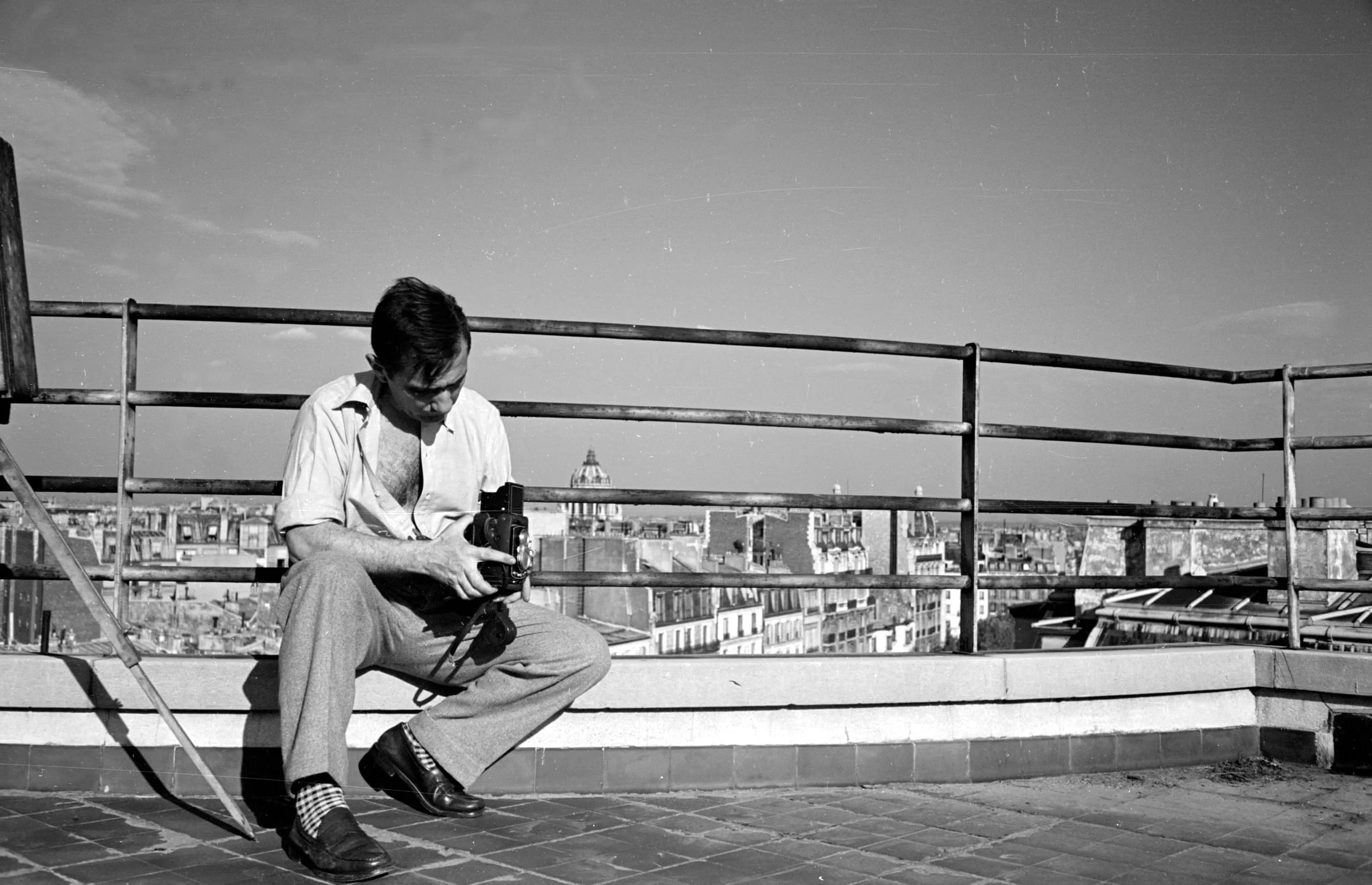 Black and white photograph of a man with dark hair sitting on a rooftop ledge, looking down at a camera he holds in both hands, city skyline visible behind him
