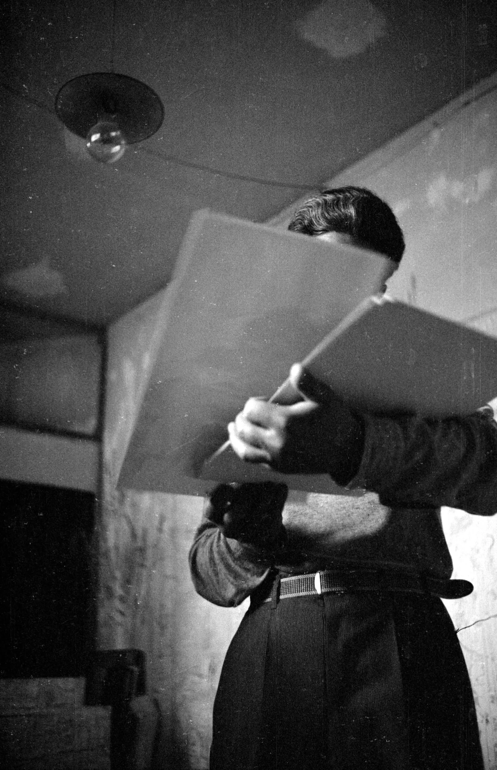 Black and white photograph of a person holding a large flat board or canvas in front of their face, gripping a thin implement, lit harshly from above in a dim interior