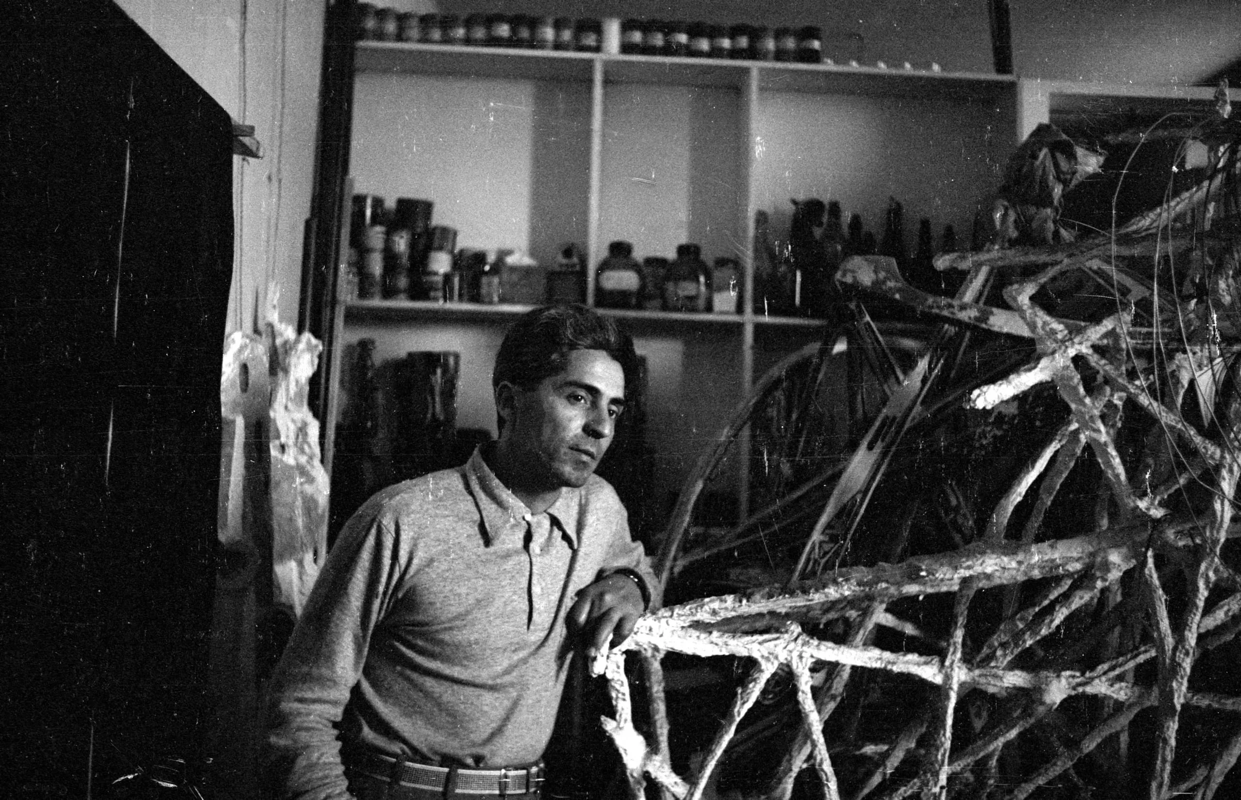 Black and white photograph of a dark-haired man leaning against a large lattice sculpture in a studio, shelves with jars visible in the distance