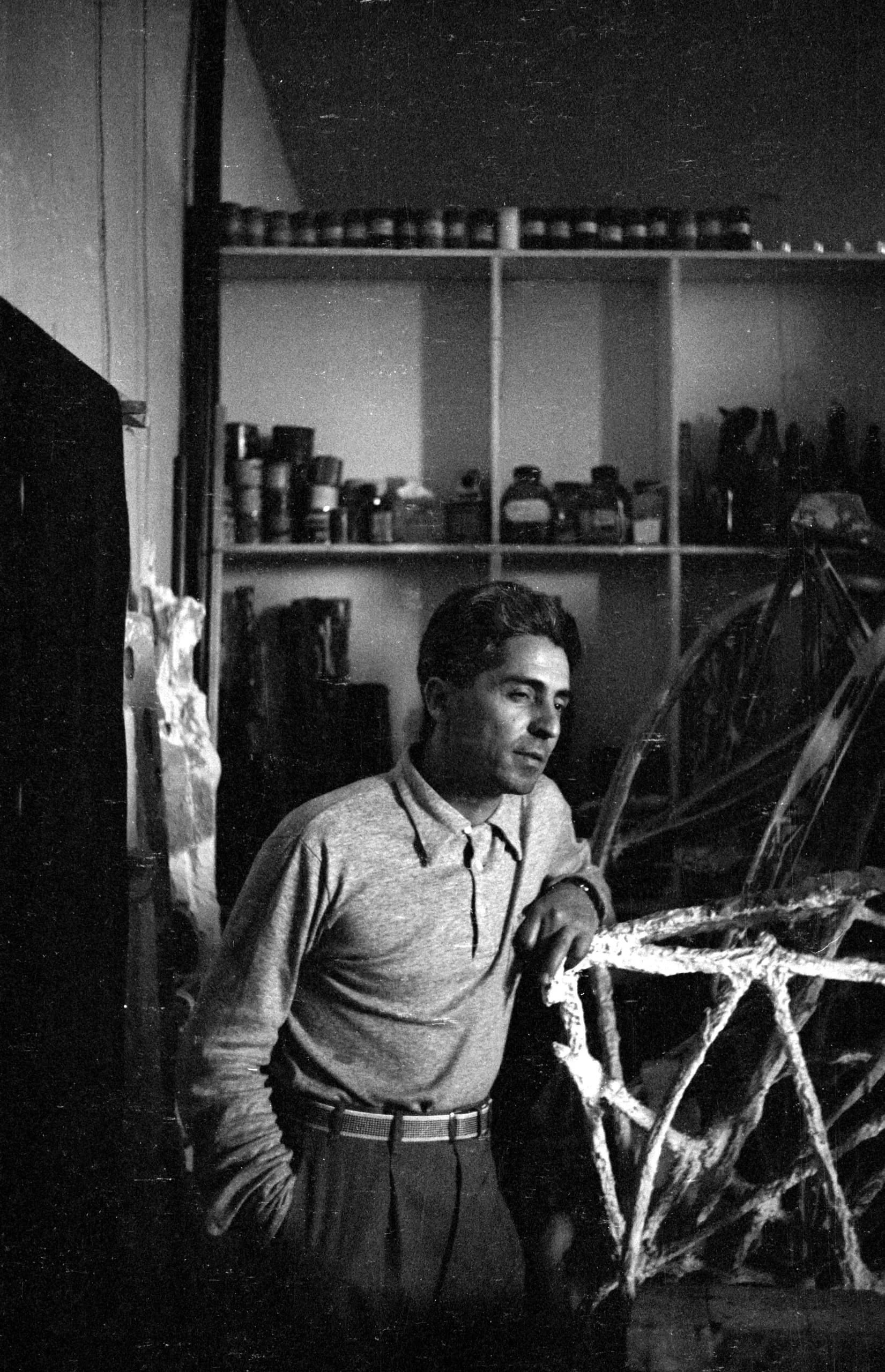 Black and white photograph of a man in a gray pullover and tie leaning against a sculptural armature in a studio, shelves of jars behind him