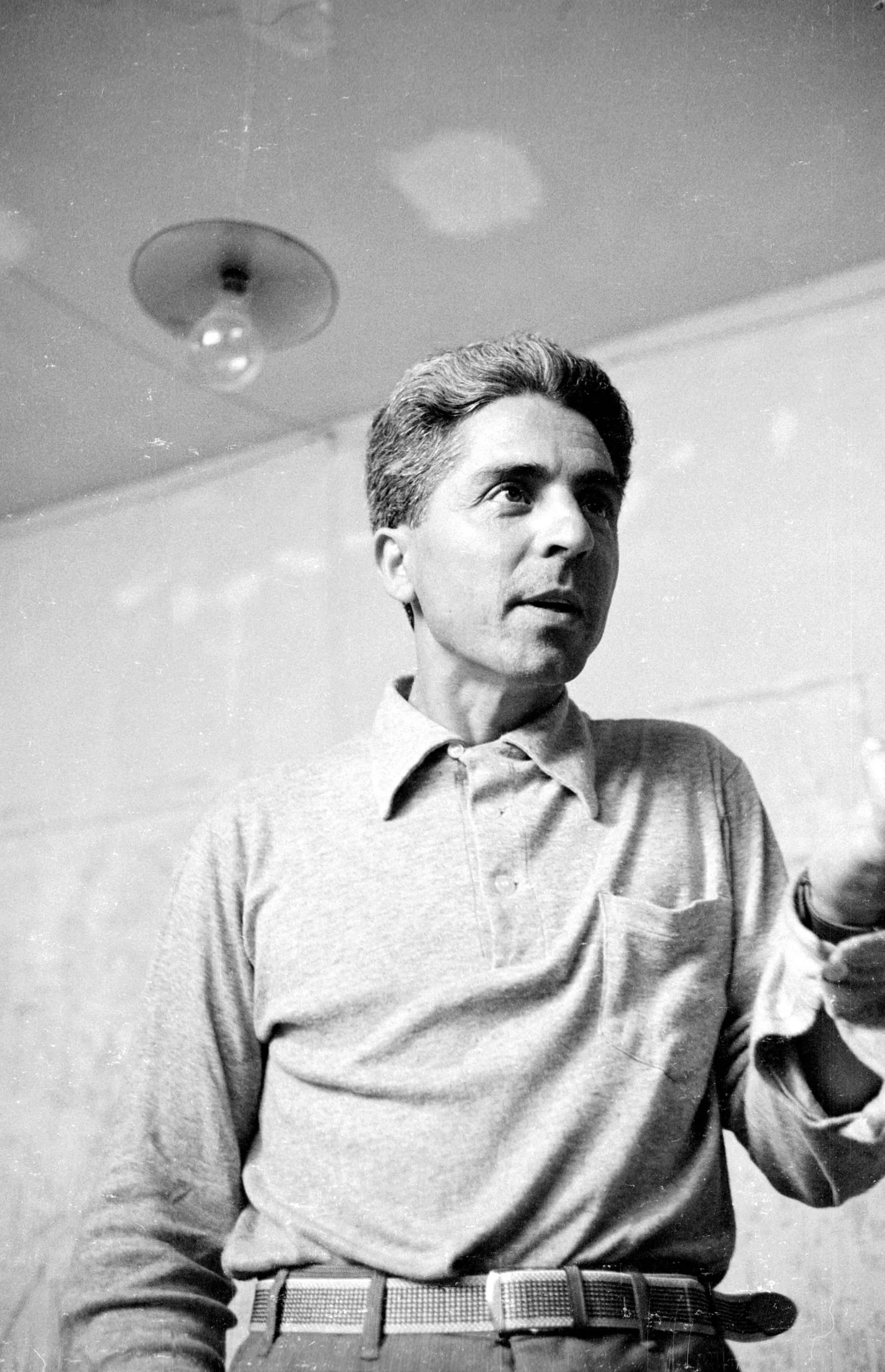 Black and white photograph, man from the waist up in a light gray pullover shirt, face turned upward to the right, one hand raised in a loose gesture, bare bulb on ceiling behind him