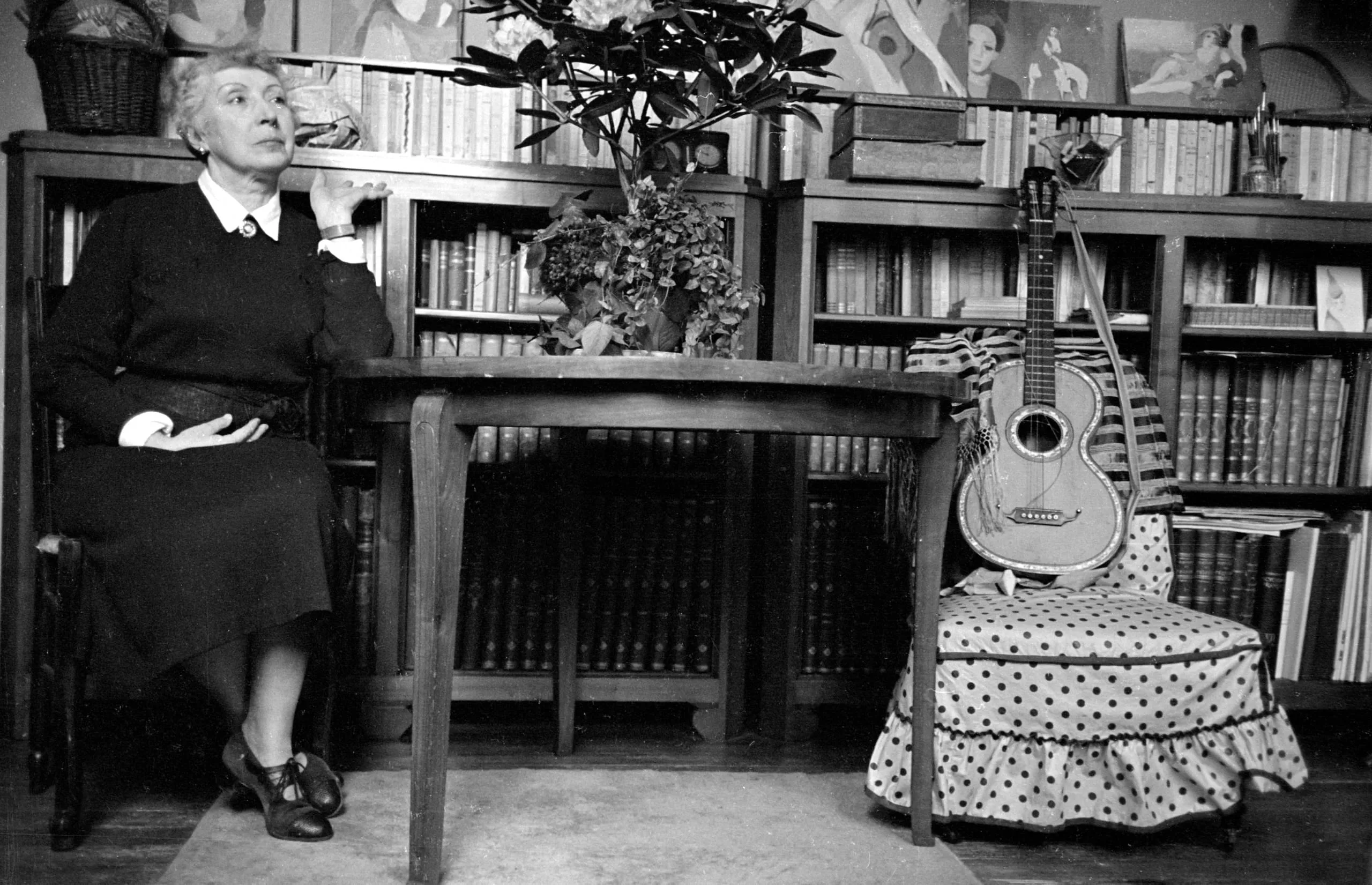 Black and white photograph of a white woman in a dark dress seated at a wooden table, looking upward, with a guitar resting on a polka-dot chair and bookshelves behind her