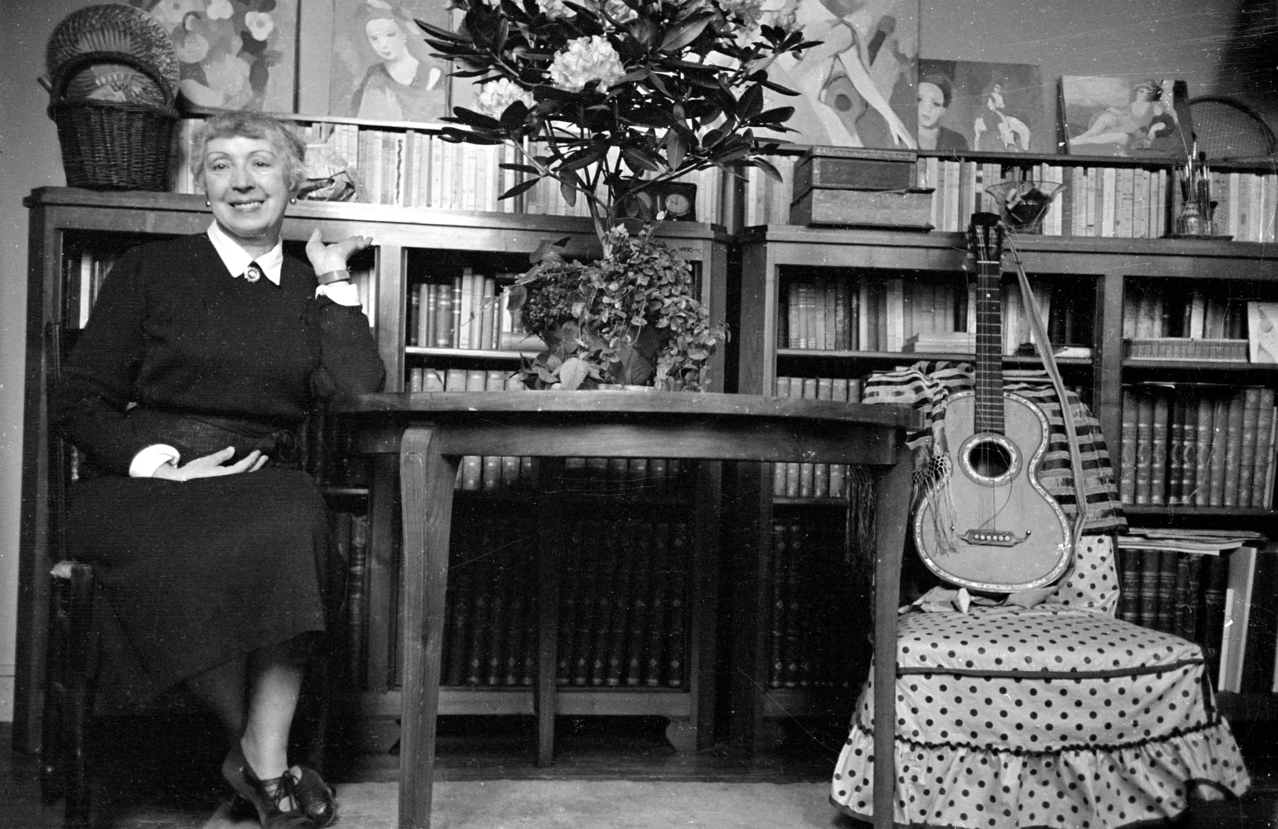 Black and white photograph of a smiling woman in a dark dress seated beside a table with a potted plant, in a room with floor-to-ceiling bookshelves and a guitar leaning against a polka-dot stool
