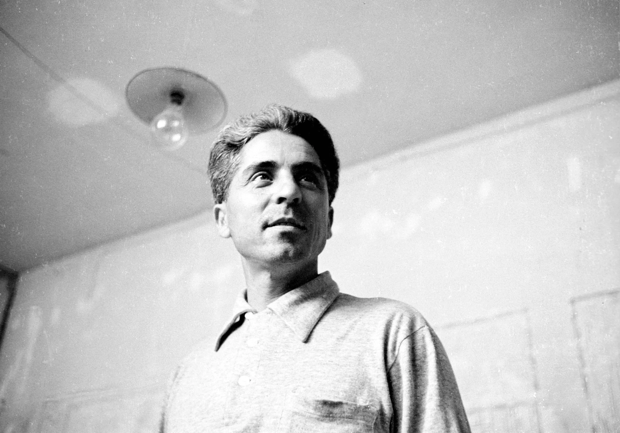 Black and white portrait photograph, man in light polo shirt photographed from below, chin tilted upward, bare light bulb visible on ceiling above