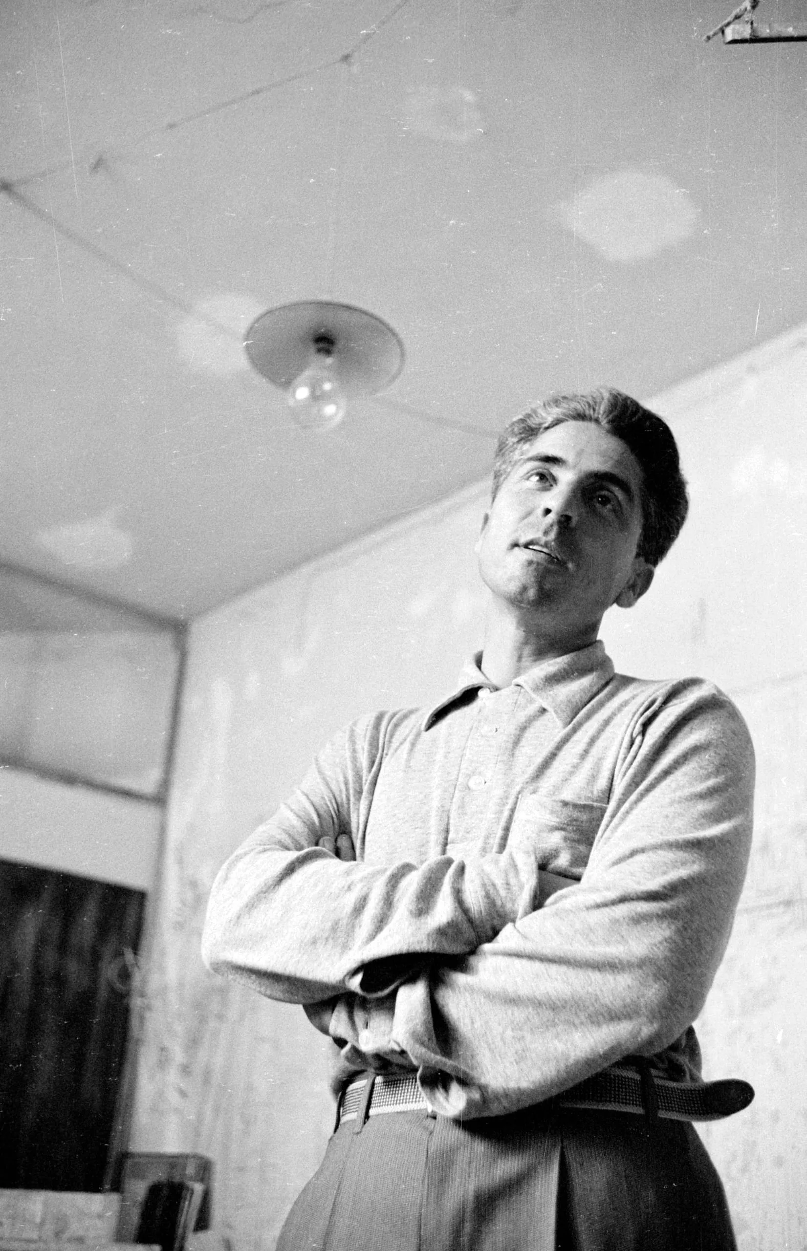 Black and white photograph, young man with arms crossed looking upward, shot from a low angle in a spare interior with a bare hanging light bulb