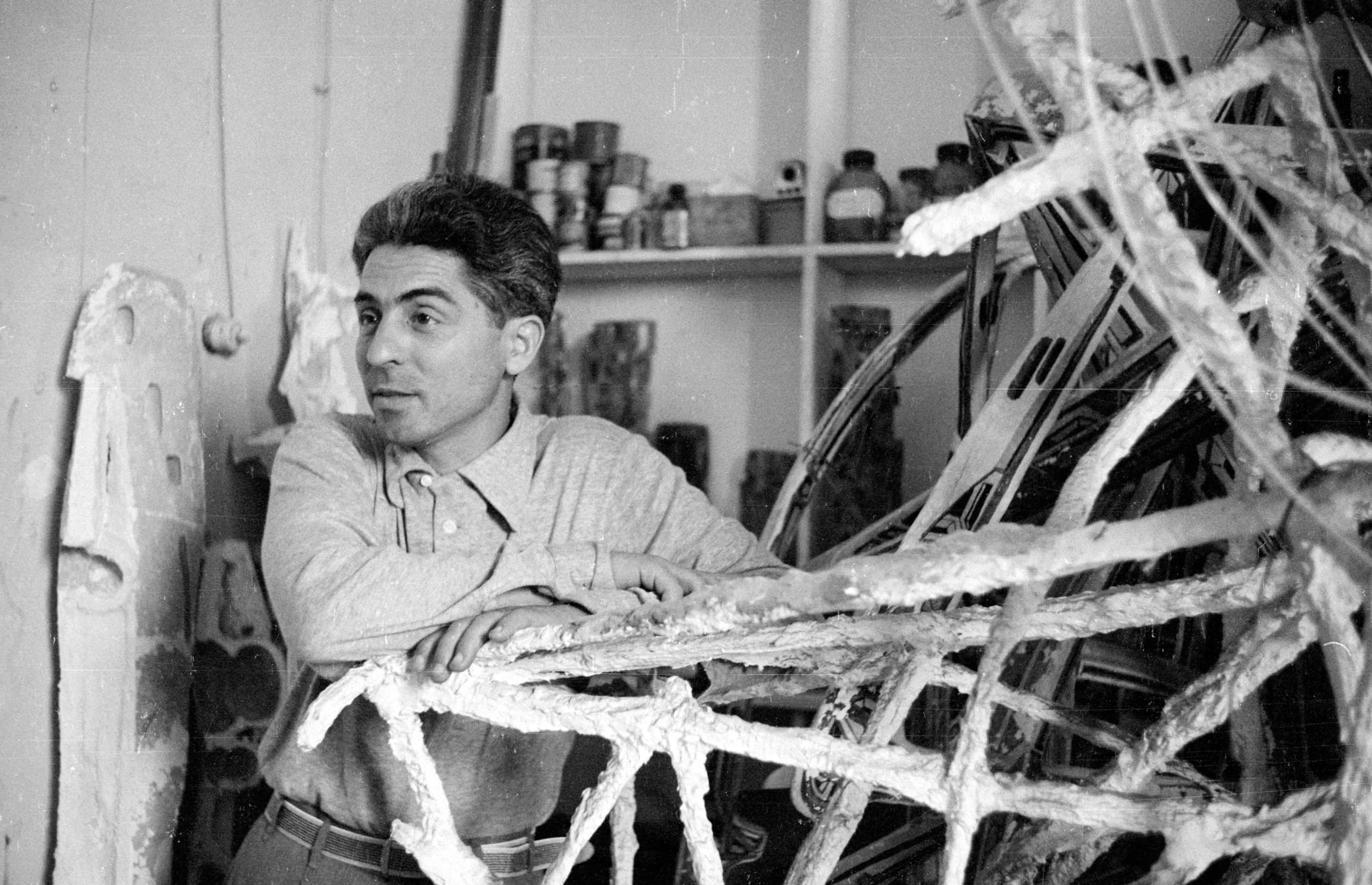 Black and white photograph of a dark-haired man leaning on a rough, plaster-coated sculptural armature in an artist's studio