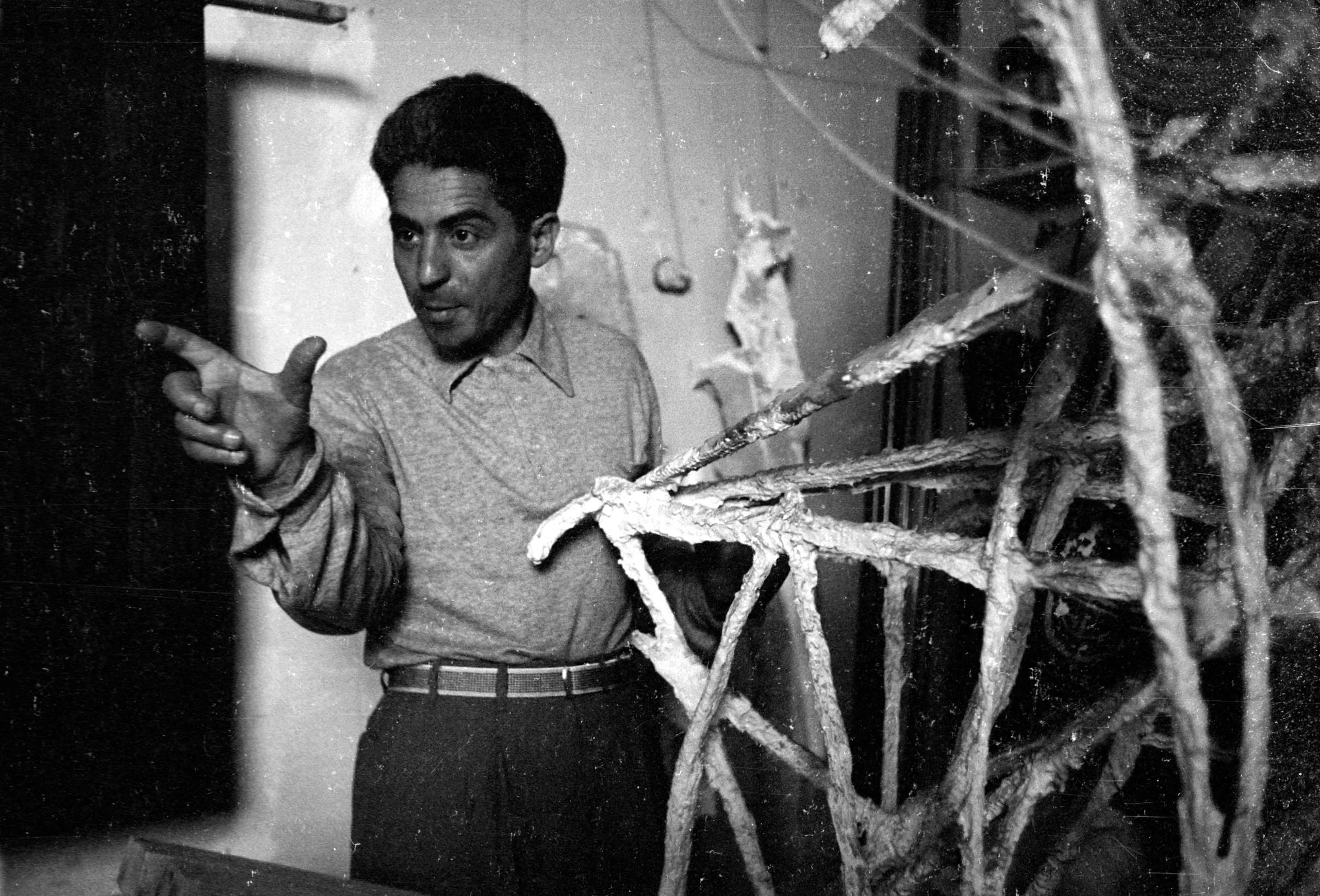 Black and white photograph of a man in a long-sleeved pullover gesturing toward a large branching sculptural structure made of rough, textured rods