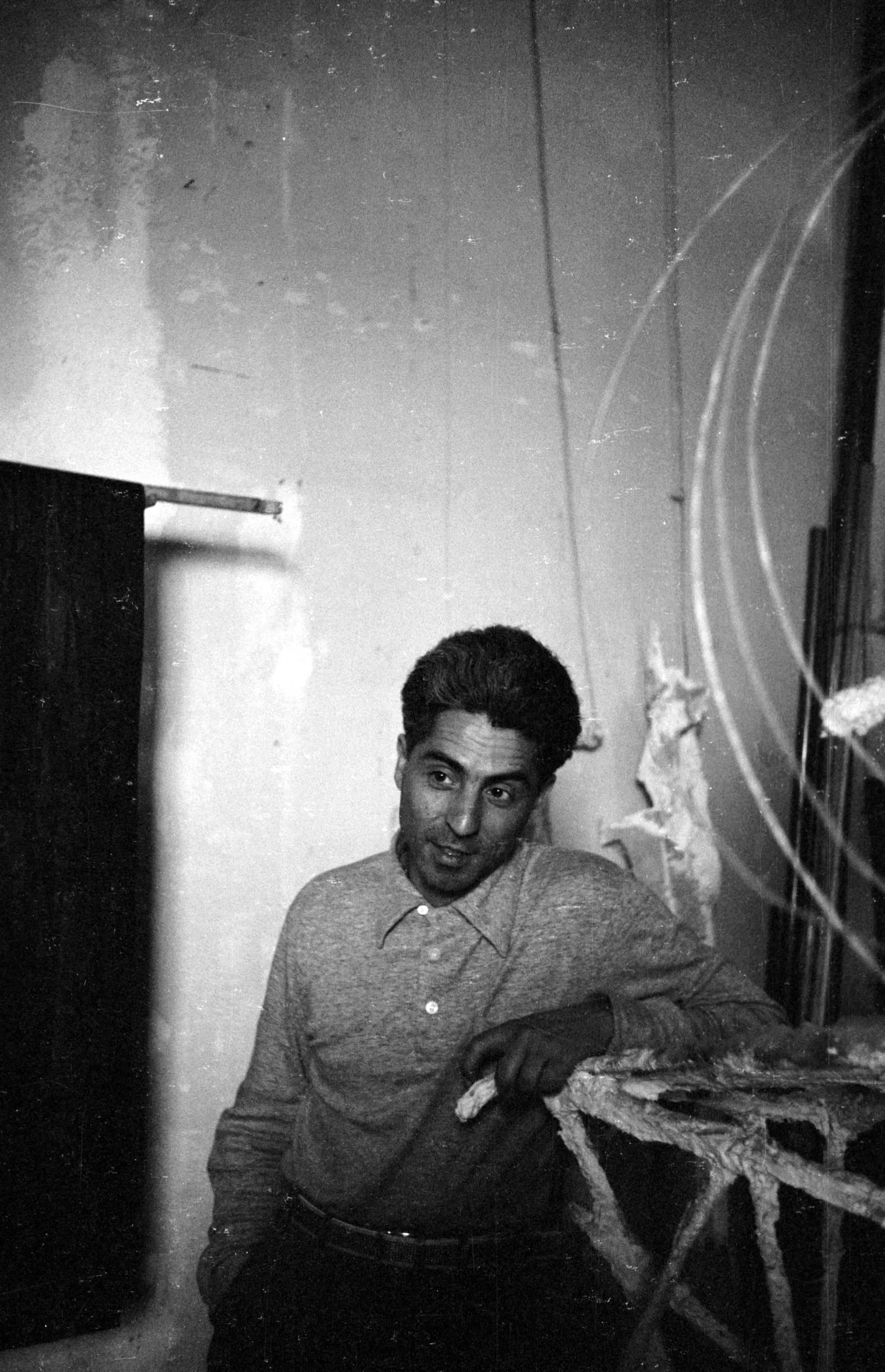 Black and white photograph of a dark-haired man leaning toward the camera in a studio, one hand resting on a rough sculptural armature of wire or rope