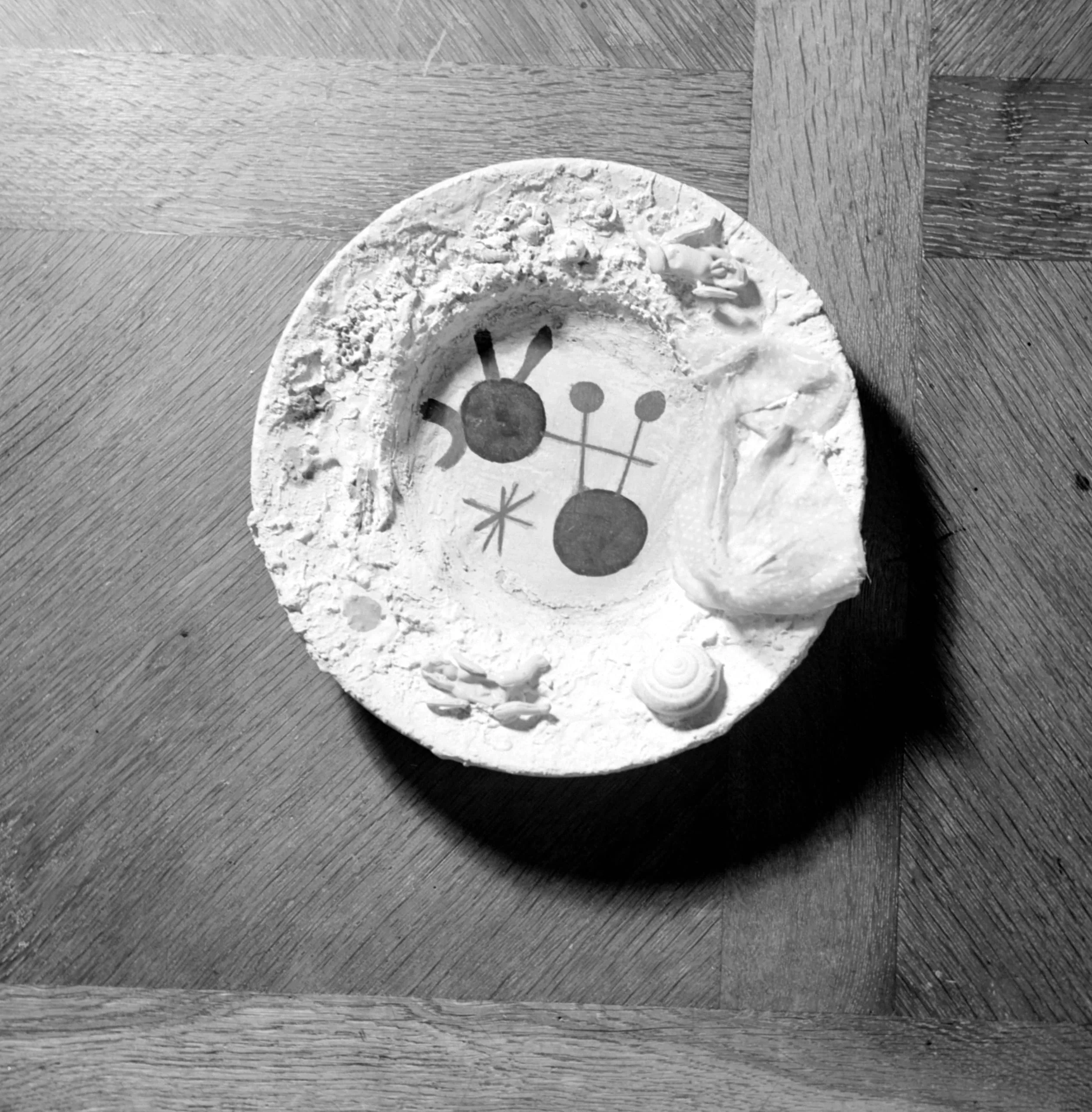 Black and white photograph of a round ceramic dish with heavily textured, encrusted rim and smooth interior painted with abstract circular and star motifs