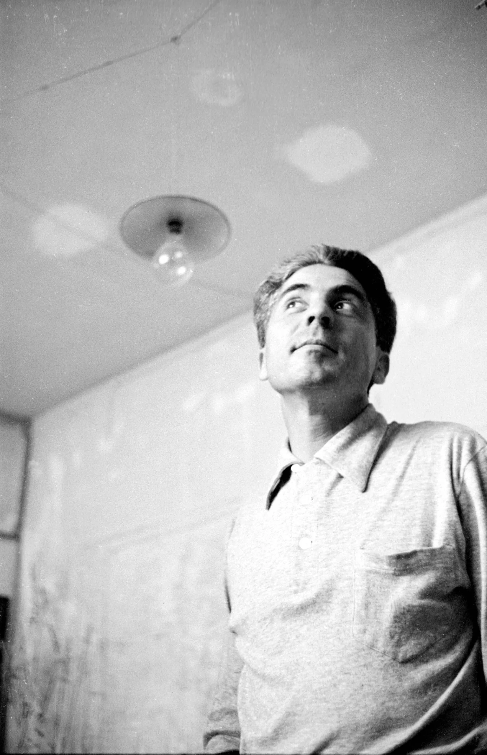 Black and white photograph, low-angle portrait of a white man in a knit polo shirt looking upward, bare ceiling light bulb visible above