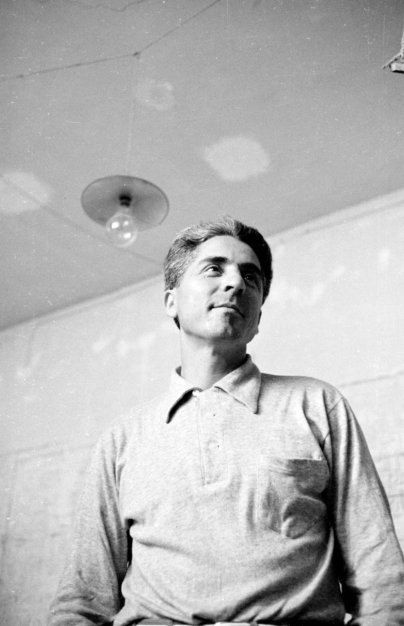 Black and white photograph, man in a light knit polo shirt photographed from below, chin tilted up, looking off to the right, with a ceiling light fixture visible above