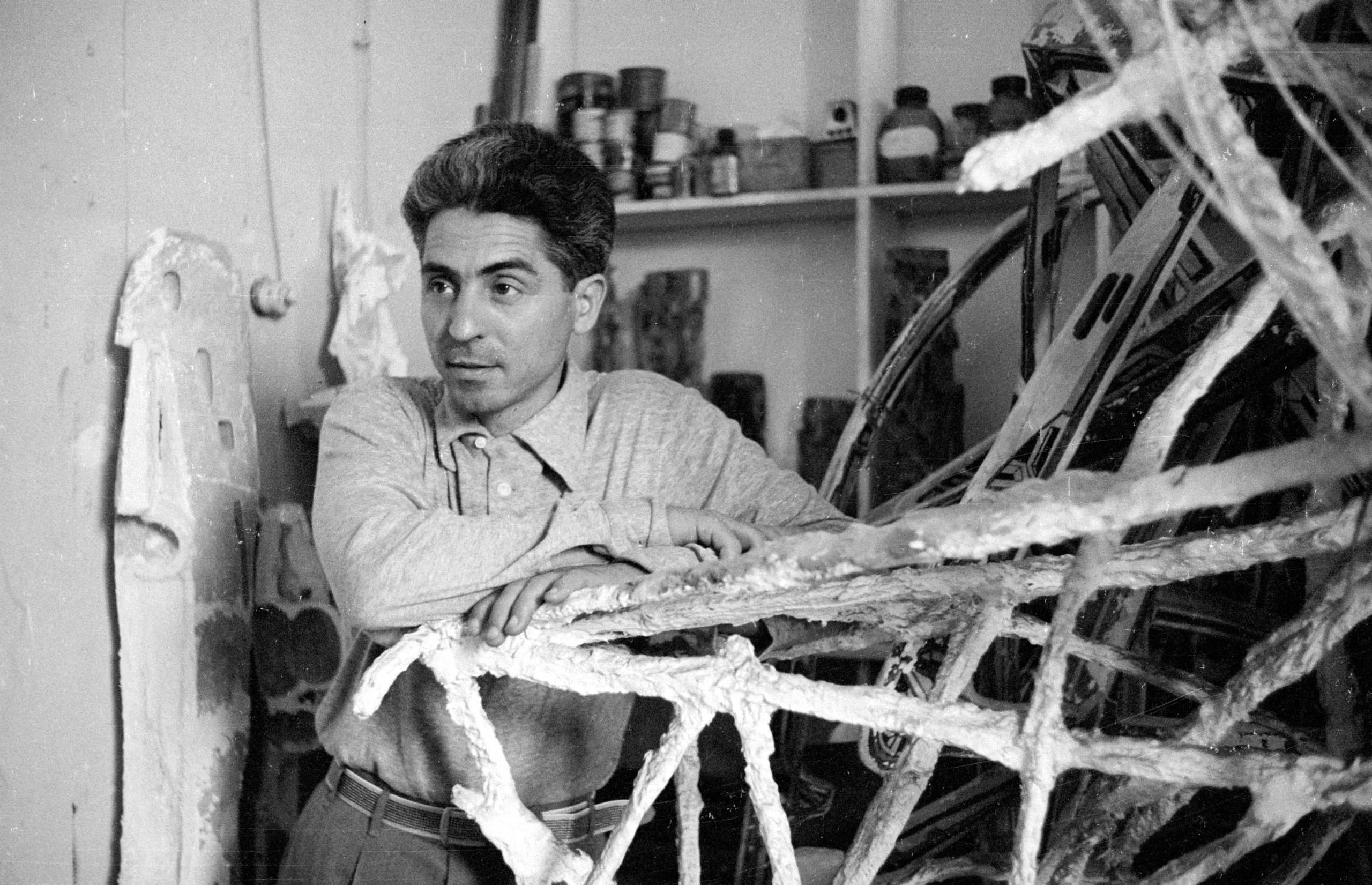 Black and white photograph of a dark-haired man leaning over a plaster-coated sculptural armature of crisscrossing rods in an artist's studio
