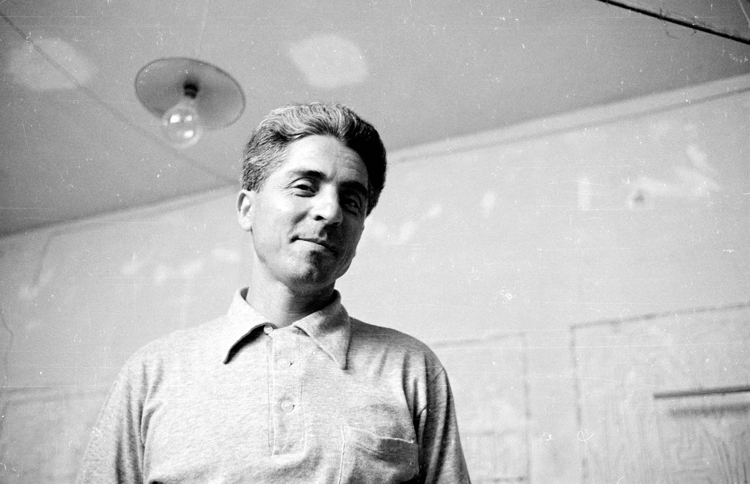 Black and white photograph, chest-up portrait of a man in a polo shirt, body angled right, head turned slightly left, soft overhead lighting