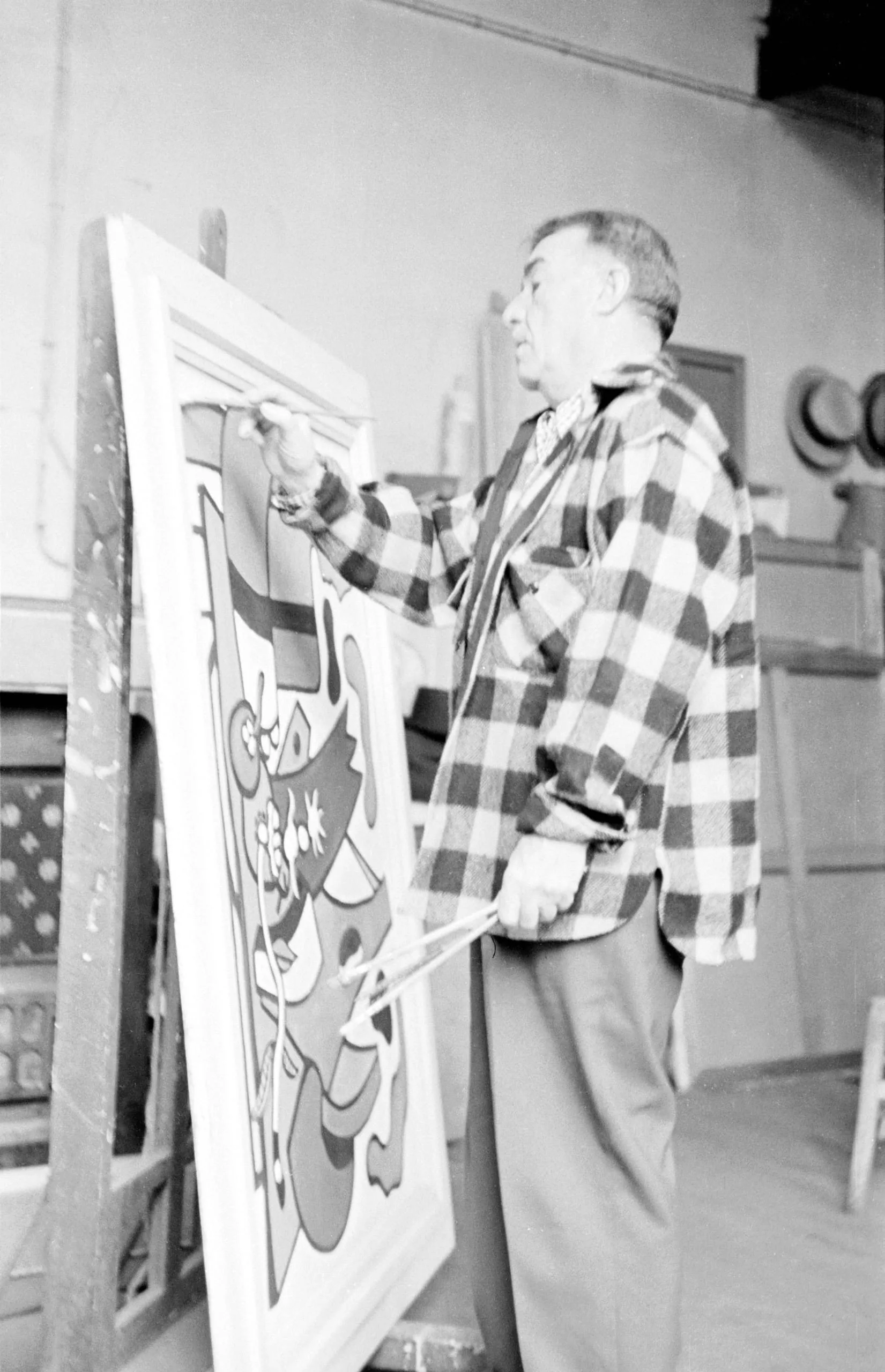 Black and white photograph of a man in a plaid flannel shirt painting a large canvas on an easel in a studio