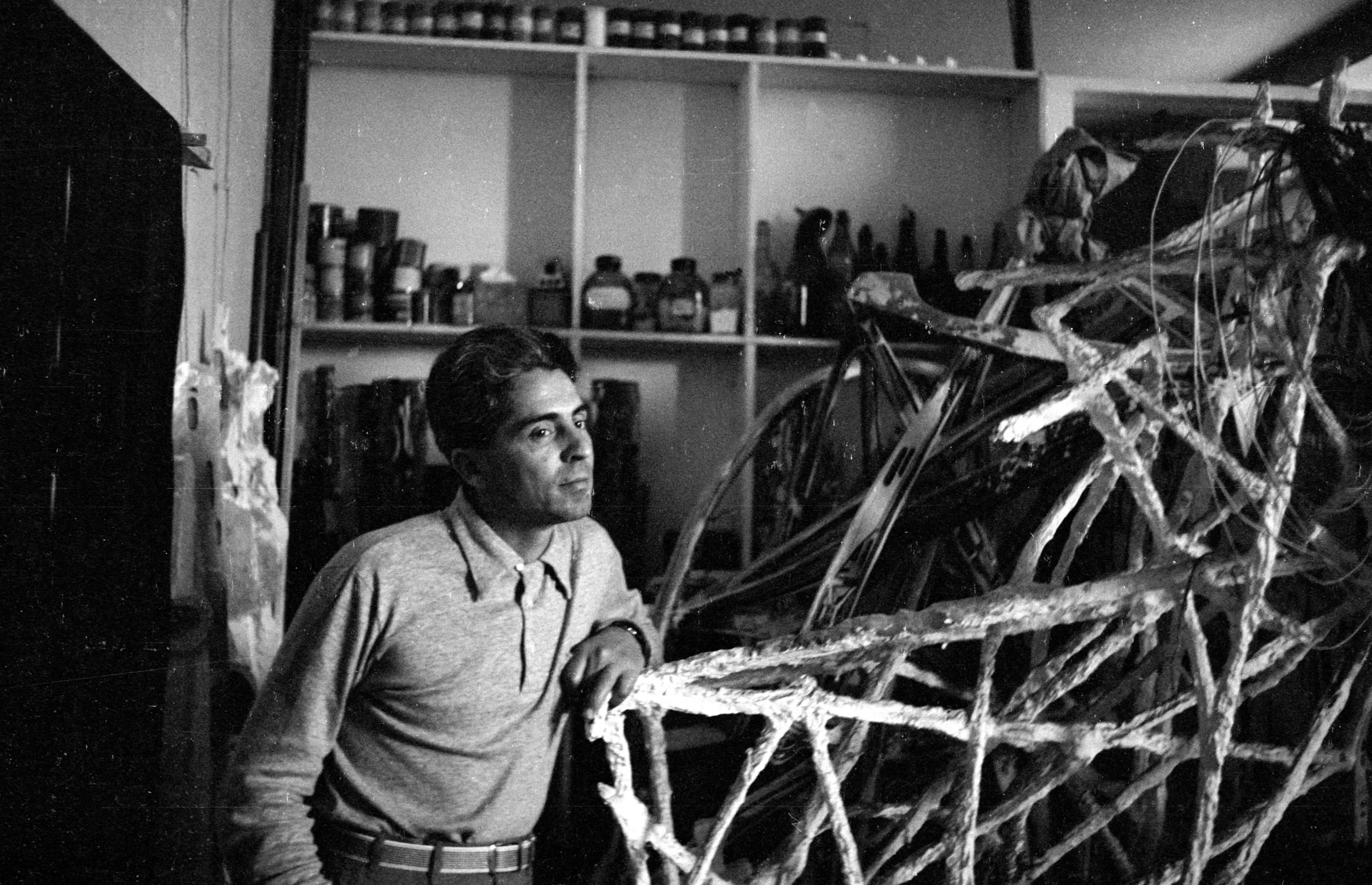 Black and white photograph of a man in a sweater leaning against a large lattice sculpture inside an artist's studio, shelves of bottles visible behind him