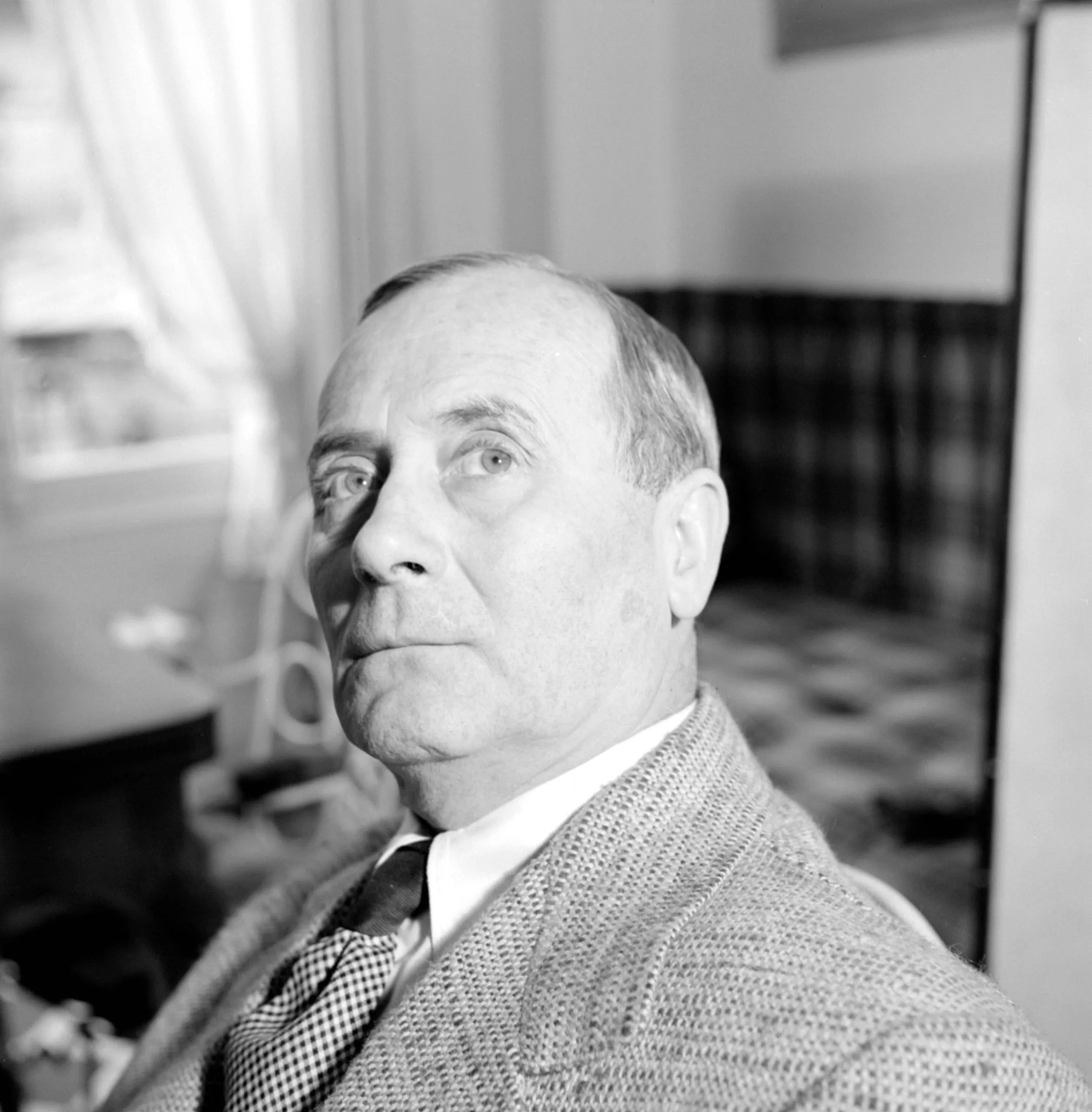 Black and white portrait photograph, white man in tweed jacket and checked tie, head tilted upward and turned slightly left, soft window light from the left