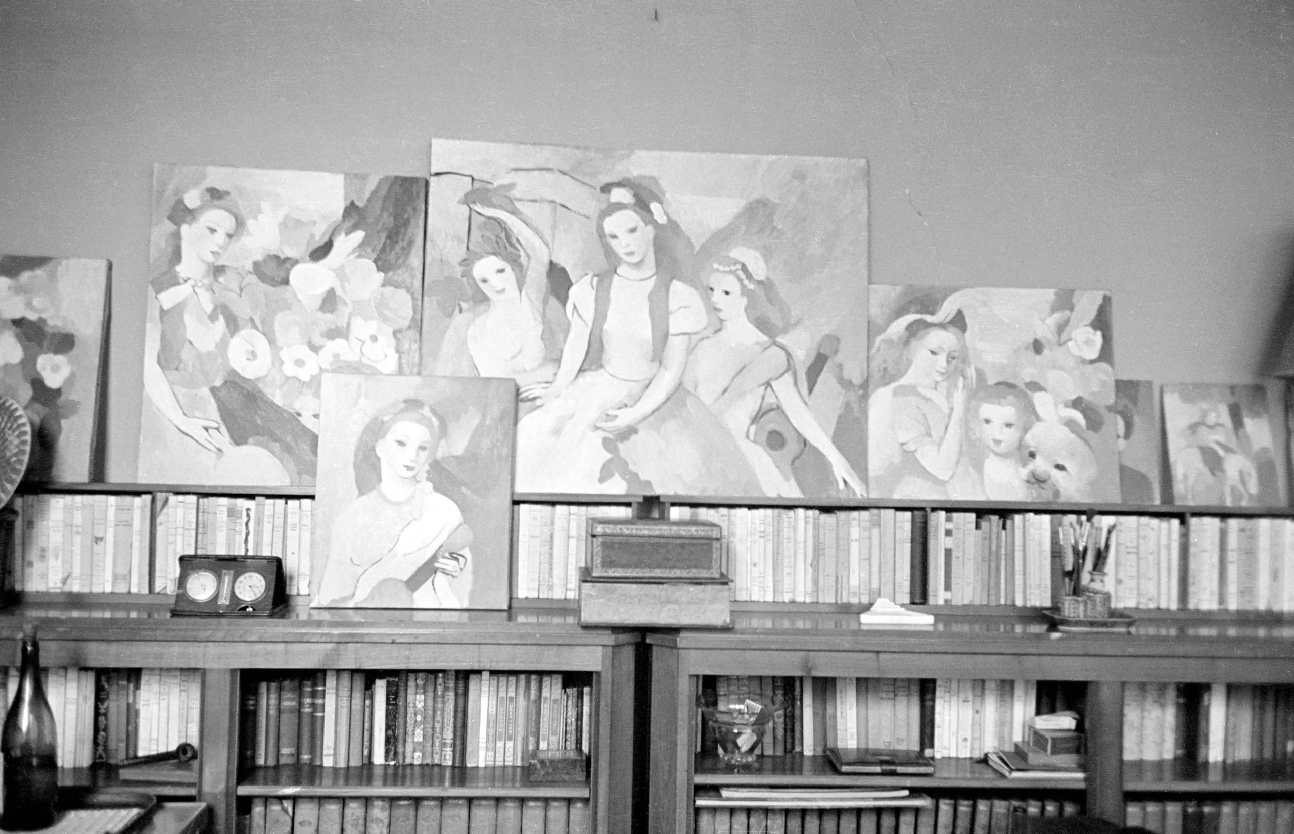 Black and white photograph of a wooden bookcase with five figurative paintings propped along the top, depicting female figures in a loose modernist style