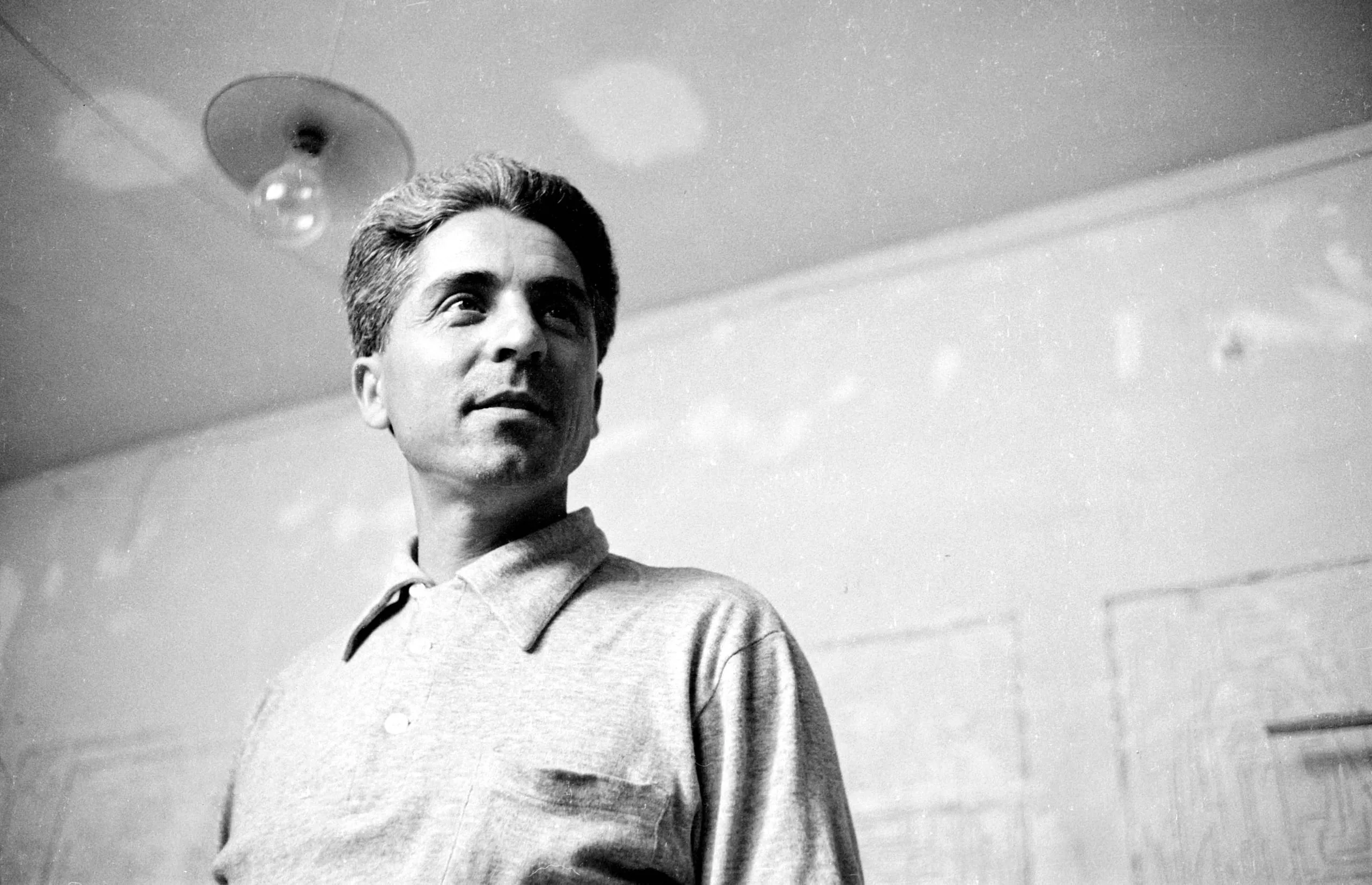 Black and white photograph, chest-up portrait of a man with dark hair looking upward and to the right, lit softly from the left, bare light bulb visible above