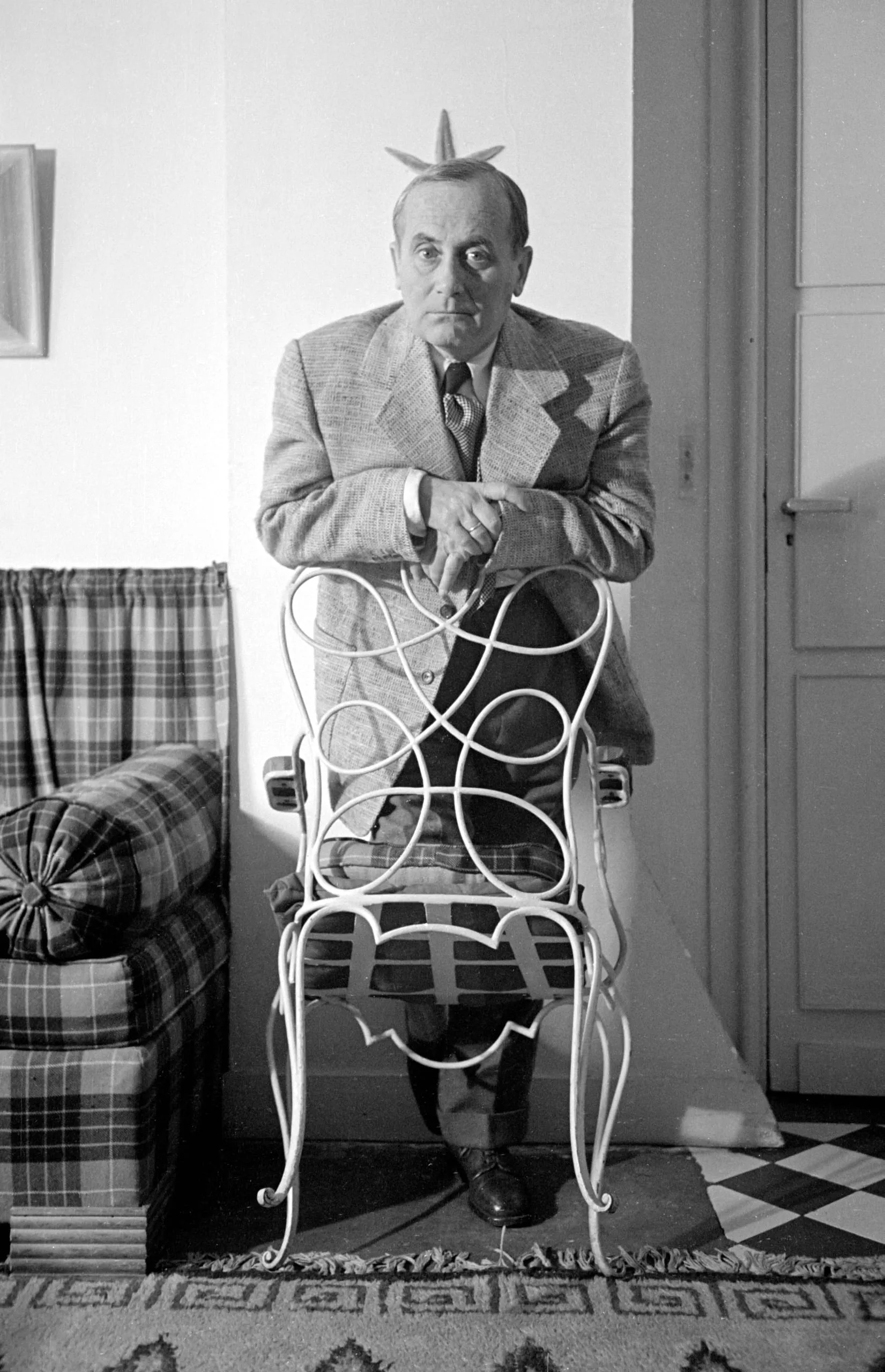 Black and white photograph of a man in a plaid sport coat seated backward on an ornate white metal chair with elaborate scrollwork, facing the camera