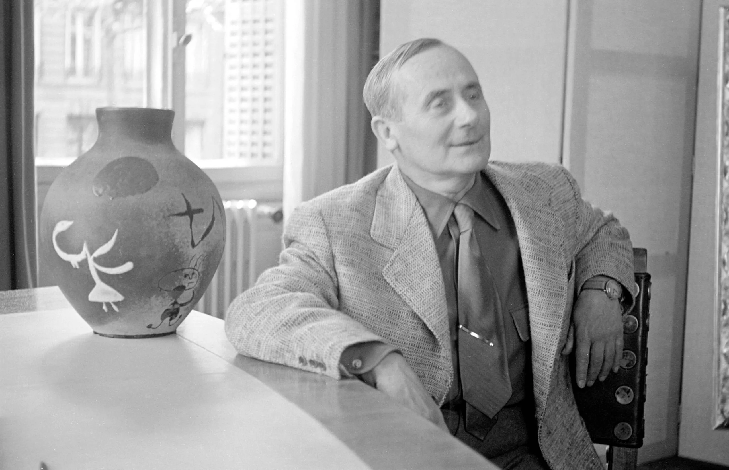 Black and white photograph of a seated man in a tweed jacket at a table beside a large decorated ceramic vase, looking to his left