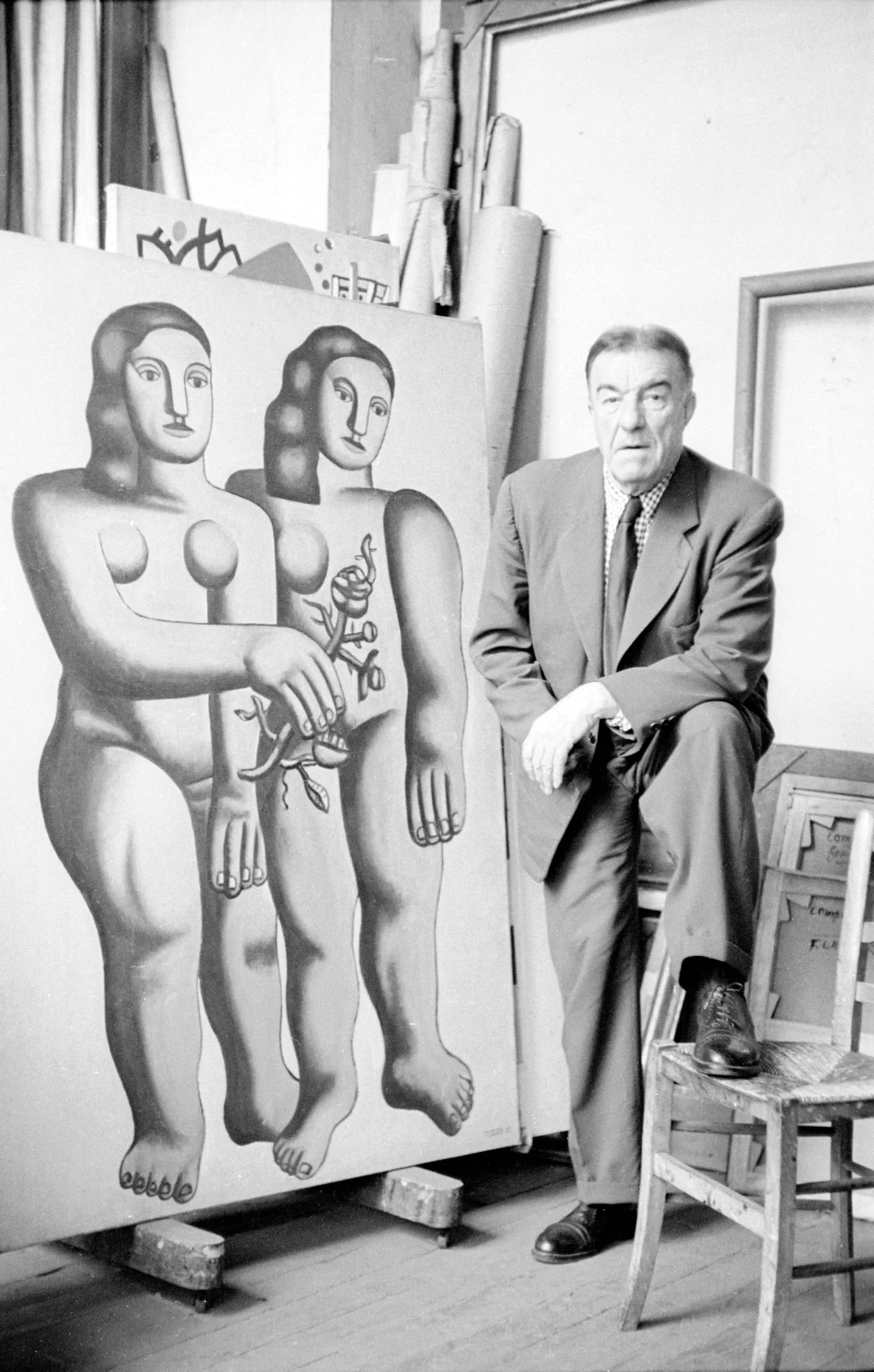 Black and white photograph of an older white man in a suit seated on a wooden chair beside a large modernist painting of two stylized nude figures in an artist's studio