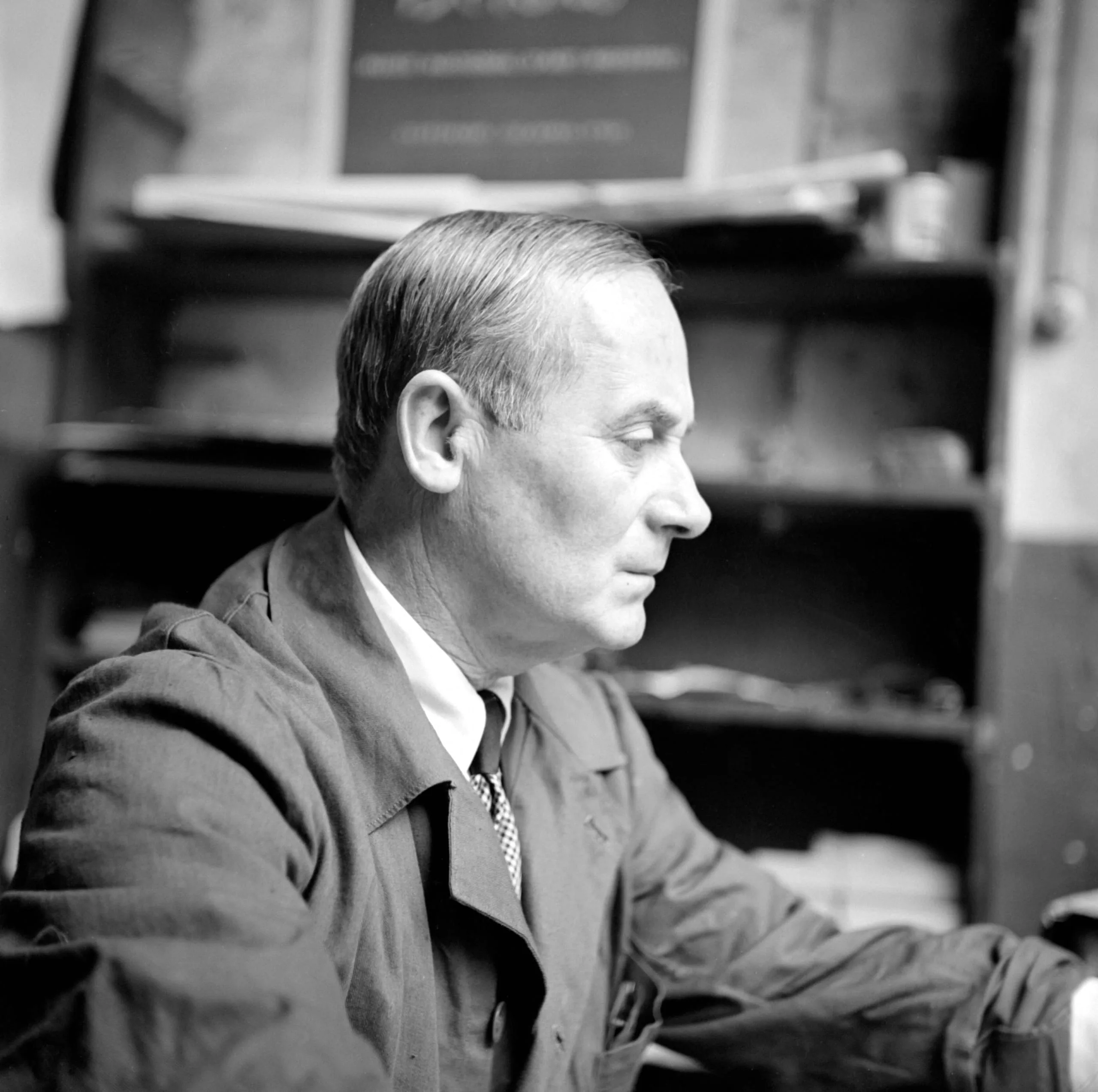 Black and white photograph, close-up portrait of a middle-aged white man in profile, wearing a dark work jacket and patterned tie, head bowed, shelving blurred in background