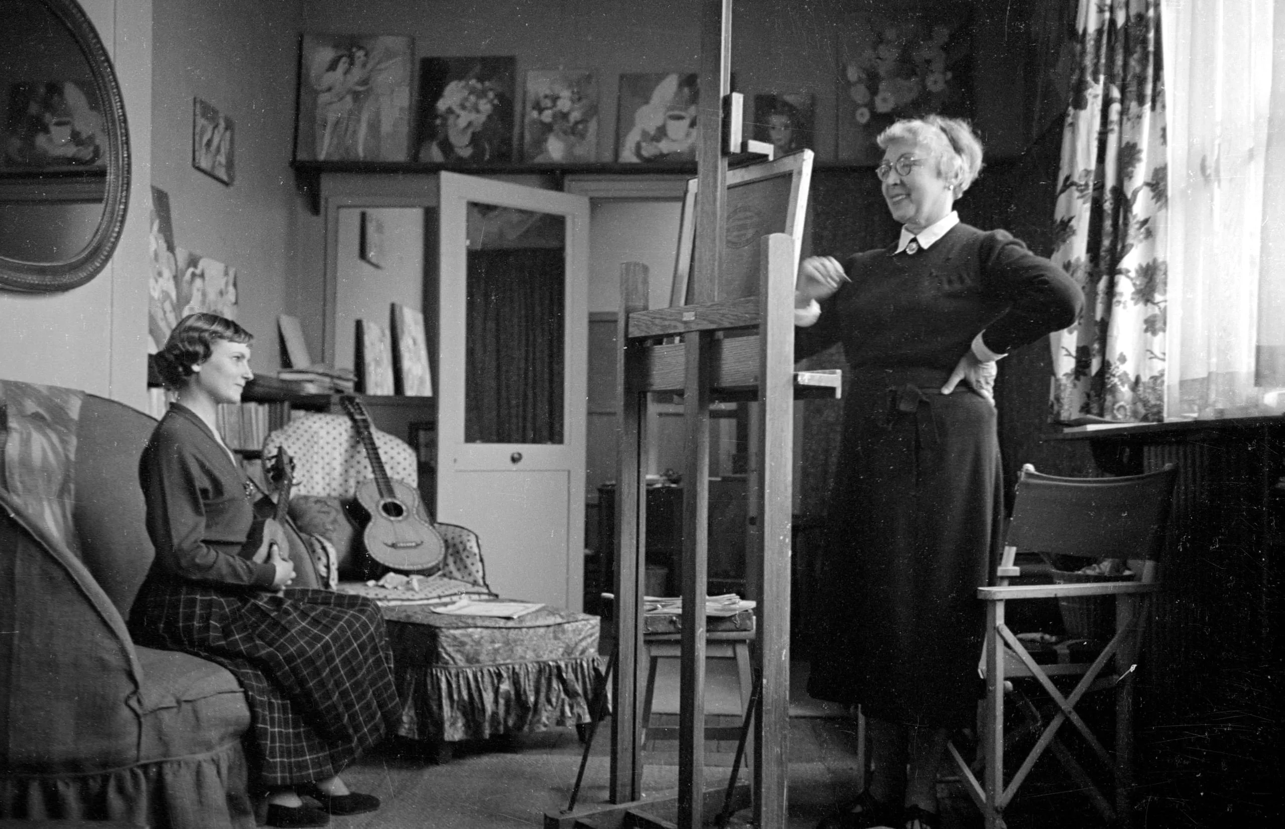 Black and white photograph of two women in an artist's studio, one seated with a small guitar and one standing at an easel, gesturing