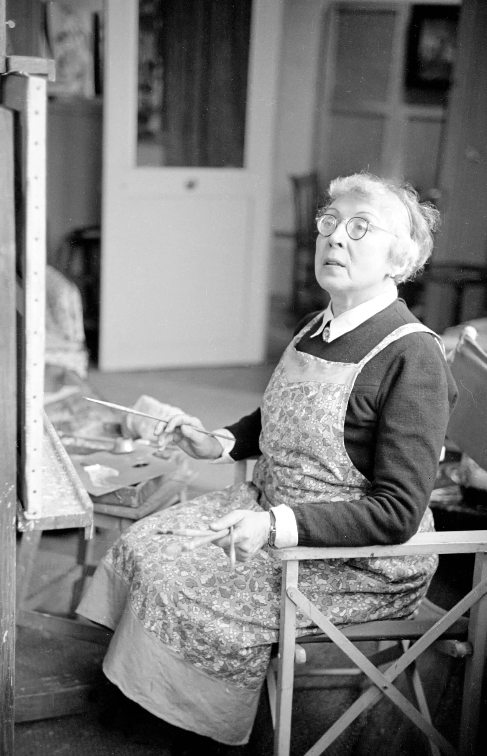 Black and white photograph of an older woman seated at an easel, holding paintbrushes, wearing glasses and a patterned apron over a dark sweater