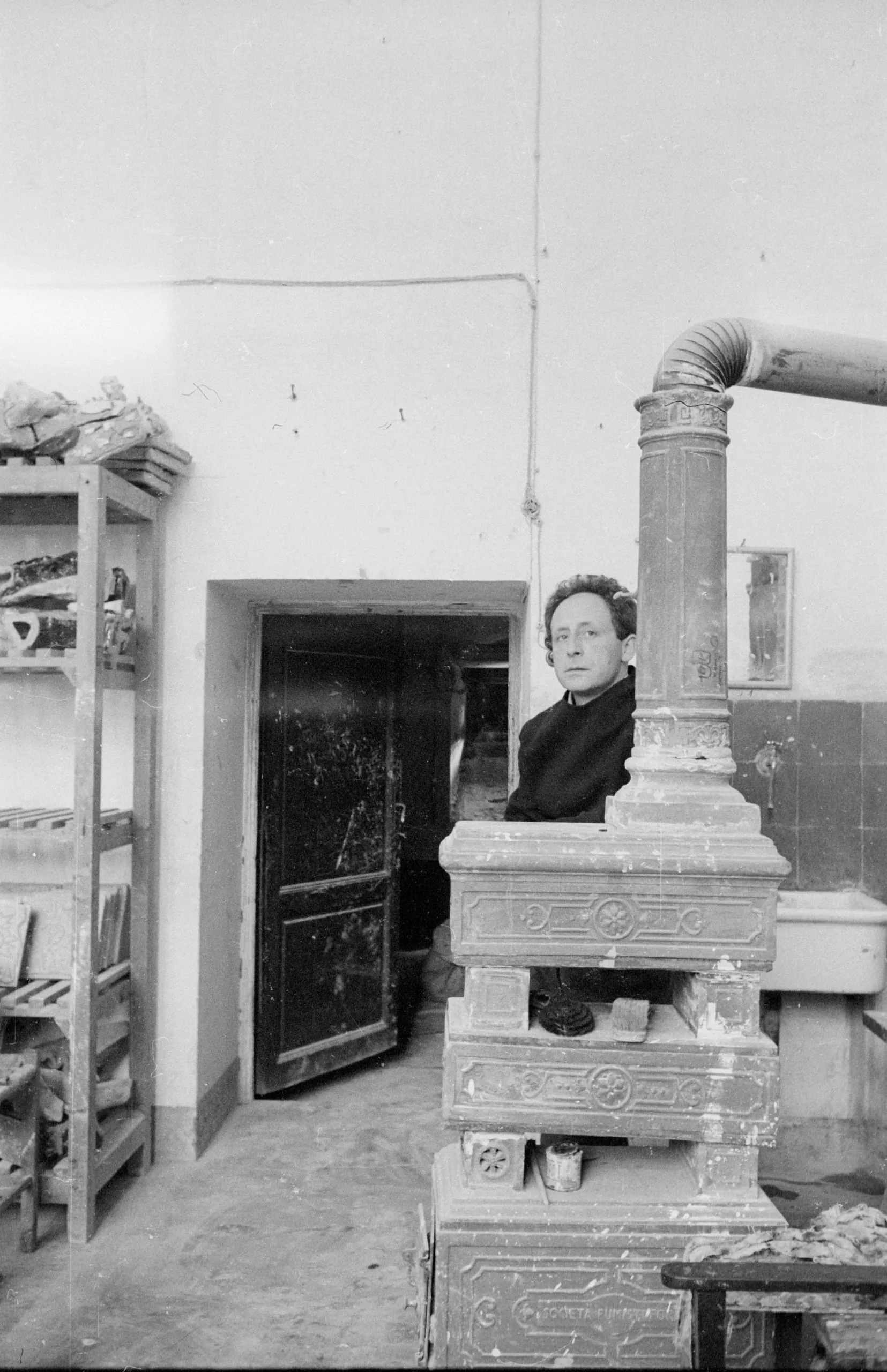 Black and white photograph of a man standing behind a large, ornately decorated ceramic stove with floral relief panels, in a sparse room with open shelving