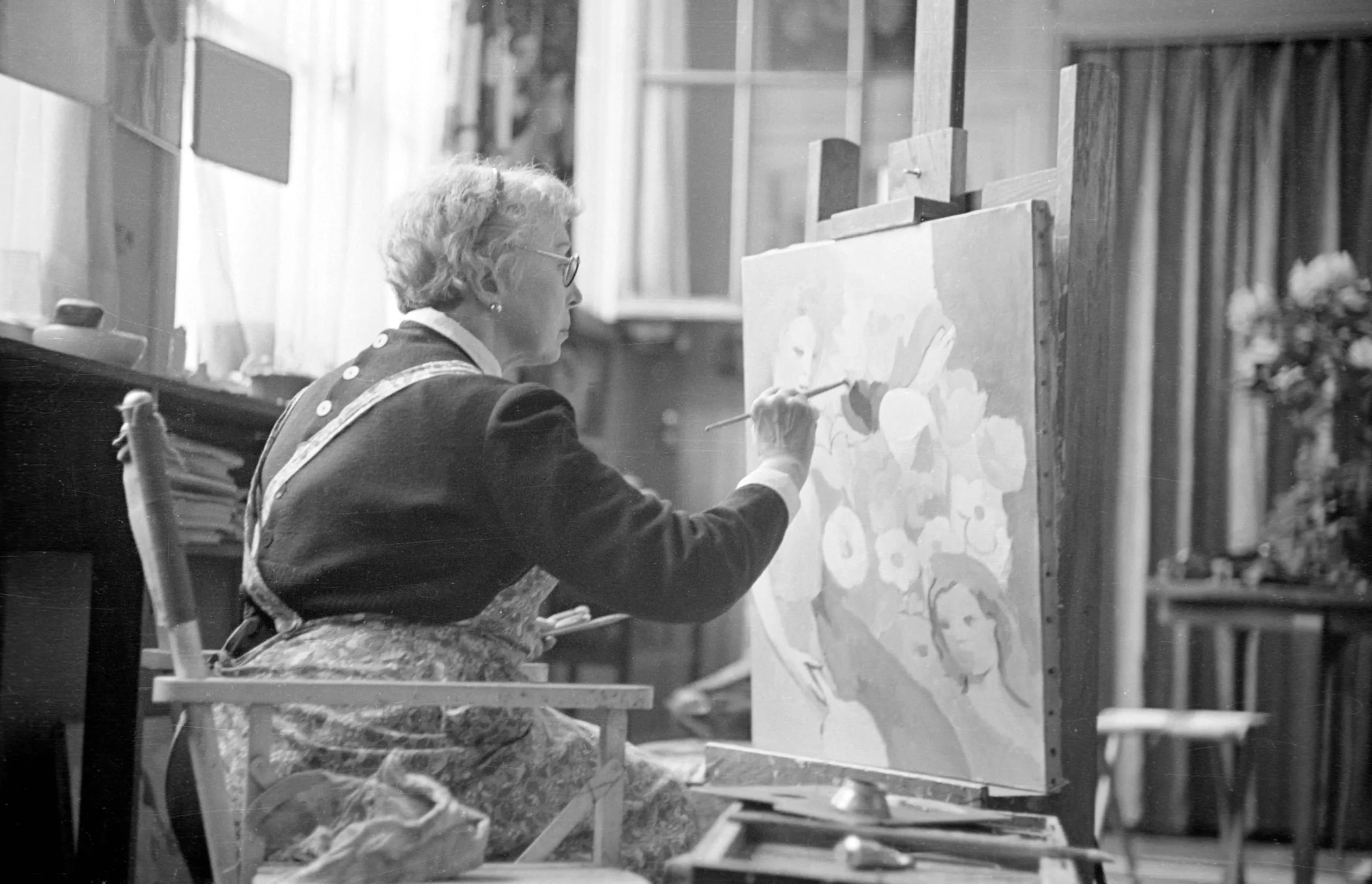 Black and white photograph of a white woman with short curly hair and glasses painting on a canvas mounted on a wooden easel in an artist's studio