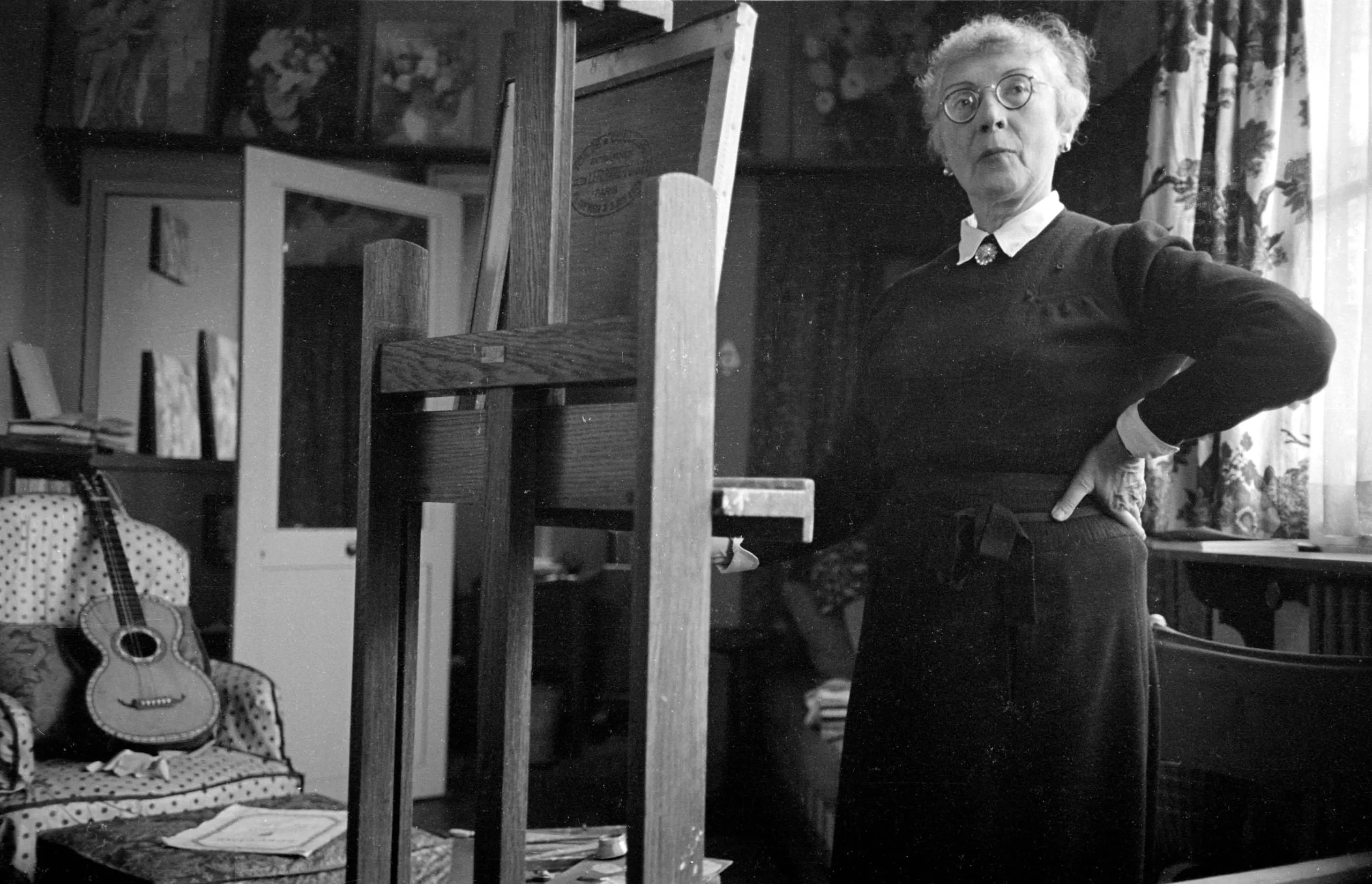 Black and white photograph of an older white woman with white hair and round glasses standing beside a tall wooden easel in a studio interior