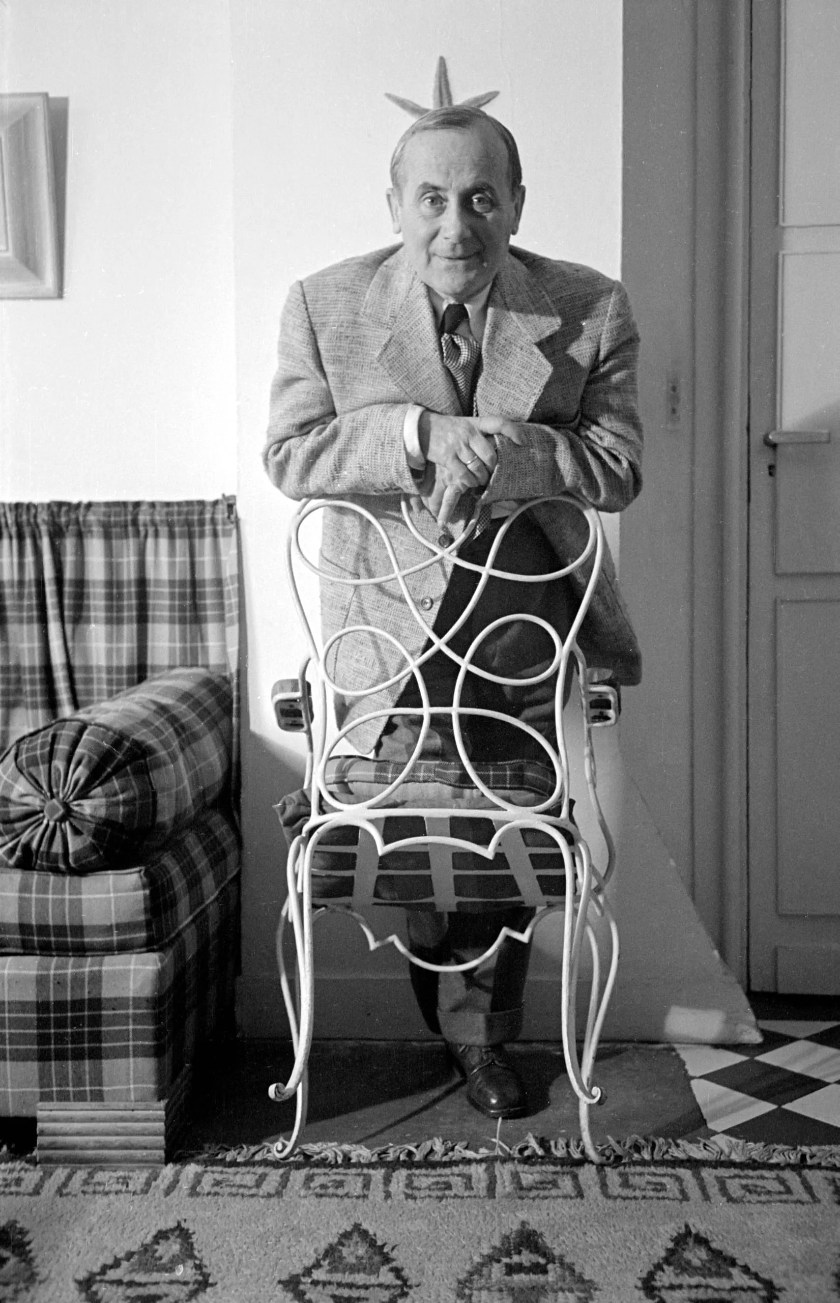 Black and white photograph of an older man in a tweed jacket standing behind an ornate, scrolling white wrought iron chair indoors, with a small cactus visible above his head